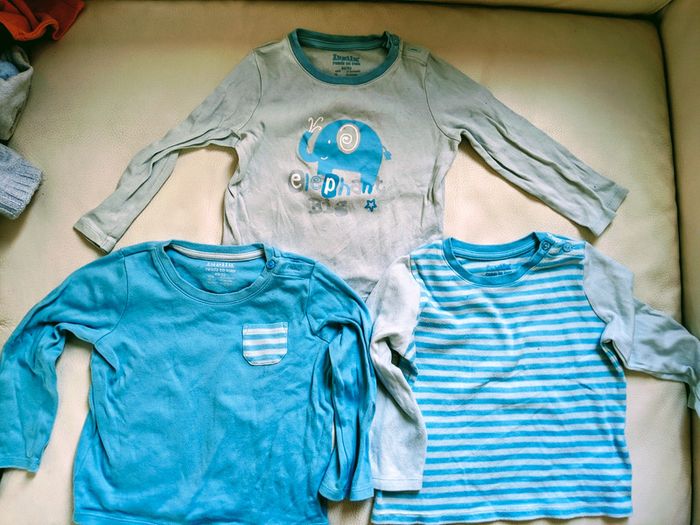 Ouverture épaule gauche par 2 jolis boutons de motif étoile, sur chacun des 3 tee shirts manches longues Motif éléphant sur l un des tee shirt. 100% coton bio Aucune tâche, porté quelques fois, bon état