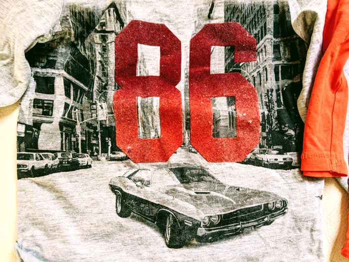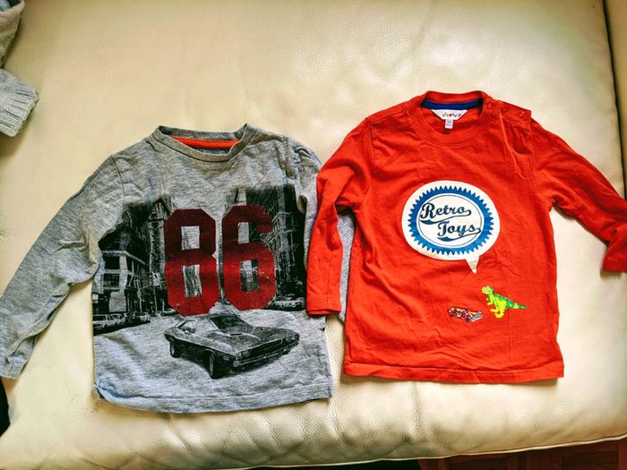 Tee shirt gris marque Tex boy taille 2-3 ans, motif vieilles voitures en ville, nombre 86 en velours, neuf, jamais porté Tee shirt orange motif rétro toys, dinosaure et voiture, marque Kidk4Naï, taille 24 mois - 86 cm Ouverture sur épaule gauche par 3 boutons-pressions Porté quelques fois 100% coton, très doux