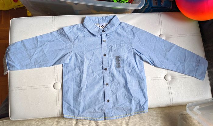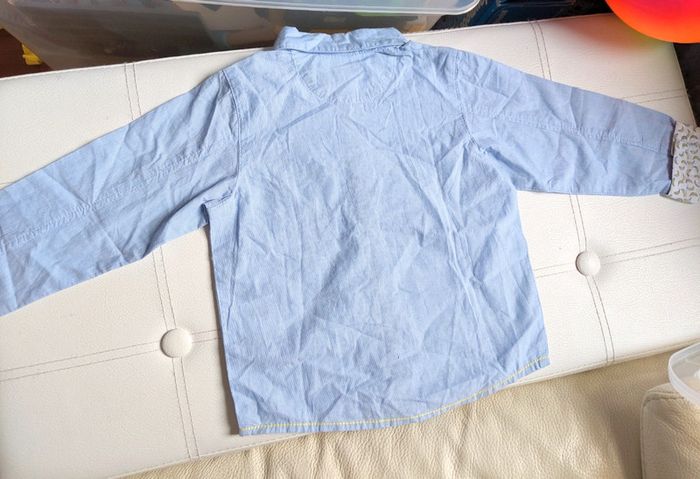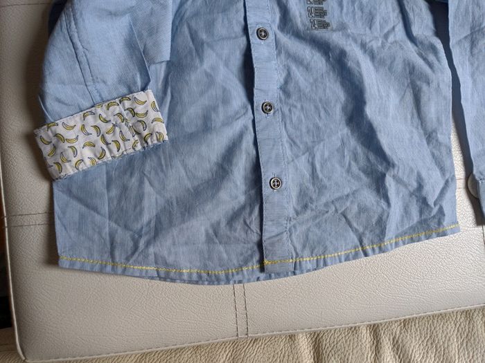 Neuf, jamais porté Très jolie chemise 100% coton Très fines rayures bleues et blanches Revers de manches à motifs bananes. Mon fils de 2 ans a une dizaine de chemises, du coup il ne peut pas tout porter. Taille 24 mois 86 cm