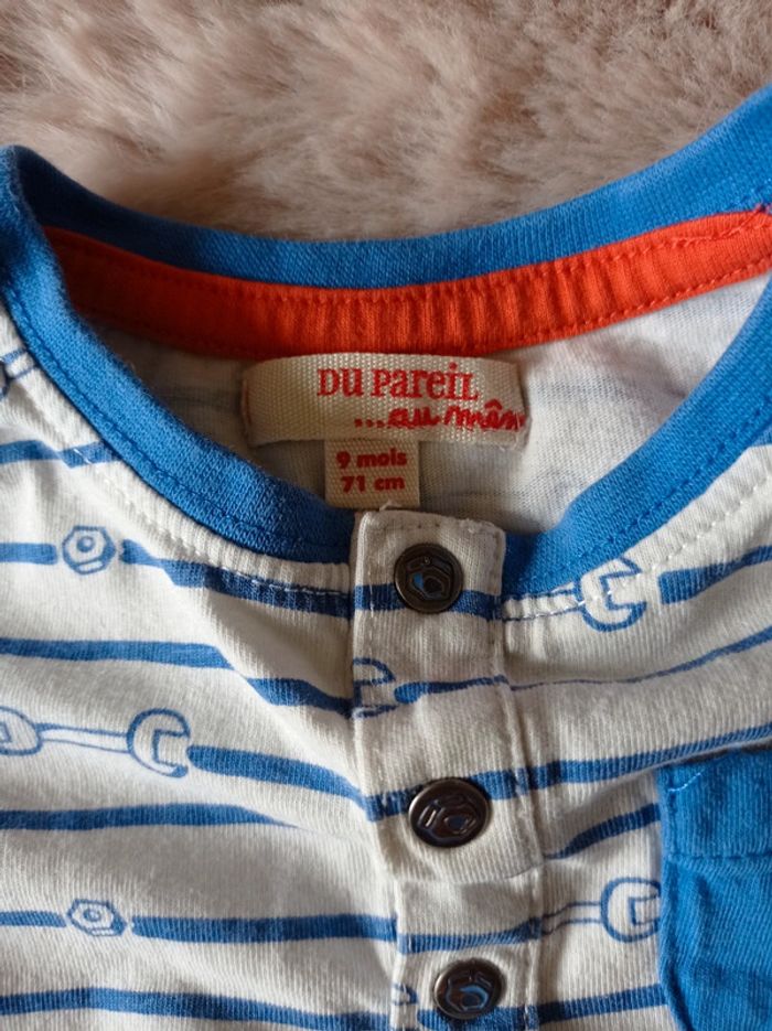 T-shirt de la marque Du Pareil au Même. Taille 9 mois Blanc, rayé bleu et clés et boulons. Pressions sur le haut devant et poche sur la poitrine. 100% coton. Pour voir toutes mes annonces en 9 mois afin de constituer un lot et bénéficier de réductions : #nanoukou_garcon_9mois Tous les liens vers les autres tailles sont à retrouver dans mon profil 😉 Merci de me contacter pour tout achat via UPS et Vinted go. Possibilité de remise en main propre sur Sizun #sizun29