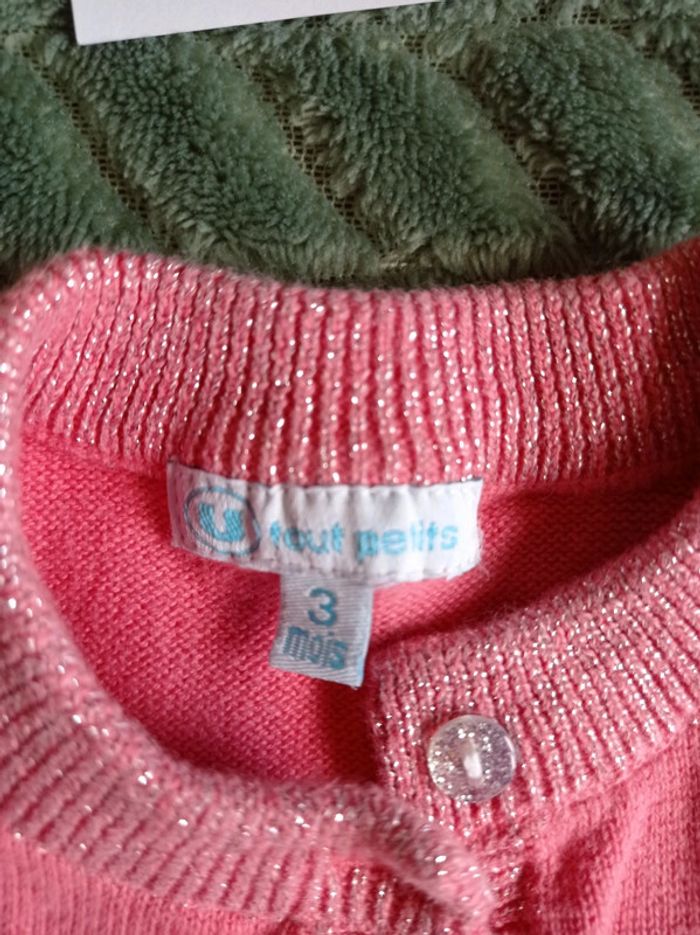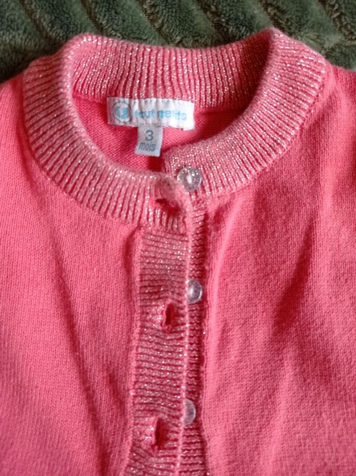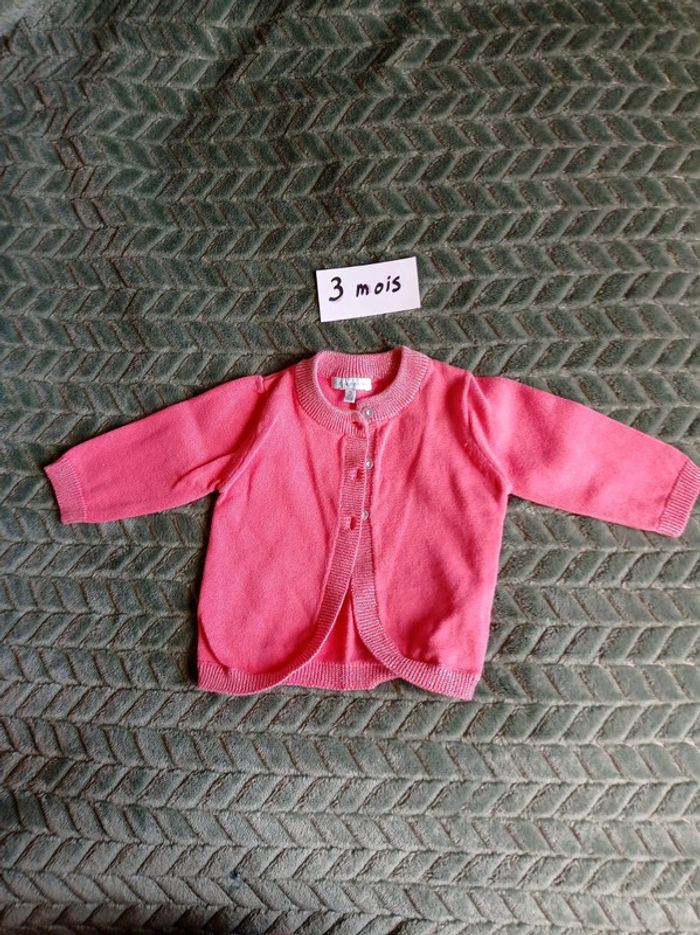 Gilet rose en 3 mois. Bordure avec fil métallique et boutons pailletés. En très bon état Pour voir toutes mes annonces en 3 mois afin de constituer un lot et bénéficier de réductions : #nanoukou_fille_3mois Merci de me contacter avant tout achat via UPS.