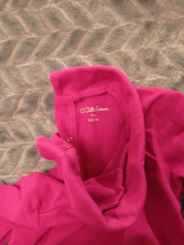 T-shirt ou sous-pull, col roulé en 3 mois. Marque Kitchoun Pressions au dos. Chaud et souple. Rose foncé (la première photo rend mieux compte de la couleur) En très bon état. Pour voir toutes mes annonces en 3 mois afin de constituer un lot et bénéficier de réductions : #nanoukou_fille_3mois Merci de me contacter avant tout achat via UPS.