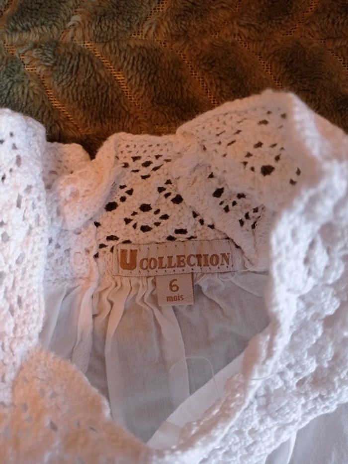Blouse en coton blanc. Manches courtes. Encolure crochetée. Entièrement ouvrable au dos. Fermée par boutons. Très peu portée. Pour voir toutes mes annonces en 6 mois afin de constituer un lot et bénéficier de réductions : #nanoukou_fille_6mois Merci de me contacter avant tout achat via UPS. #nanoukou_fille_6mois_été