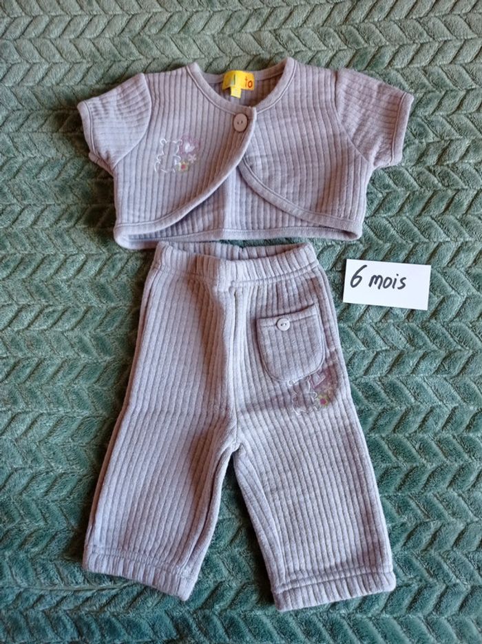Ensemble gris molletonné de la marque Culbuto comprenant un pantalon avec poche et un boléro brodé d'un petit ours.