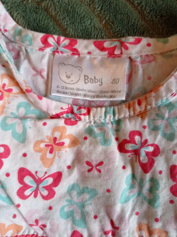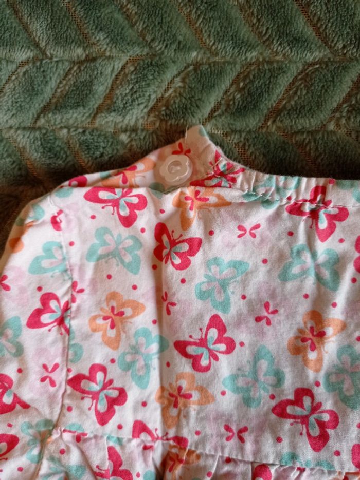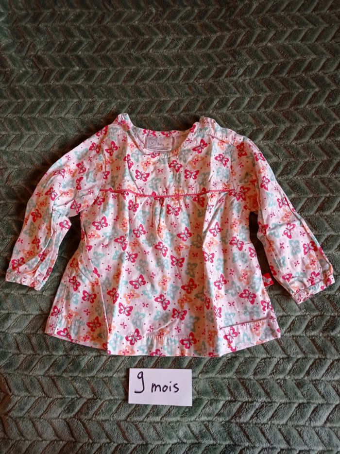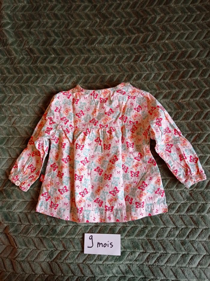 Blouse 9 mois. Tissu fond blanc motif papillons. Bouton aux épaules. En très bon état. Pour voir toutes mes annonces en 9 mois afin de constituer un lot et bénéficier de réductions : #nanoukou_fille_9mois Merci de me contacter avant tout achat via UPS.