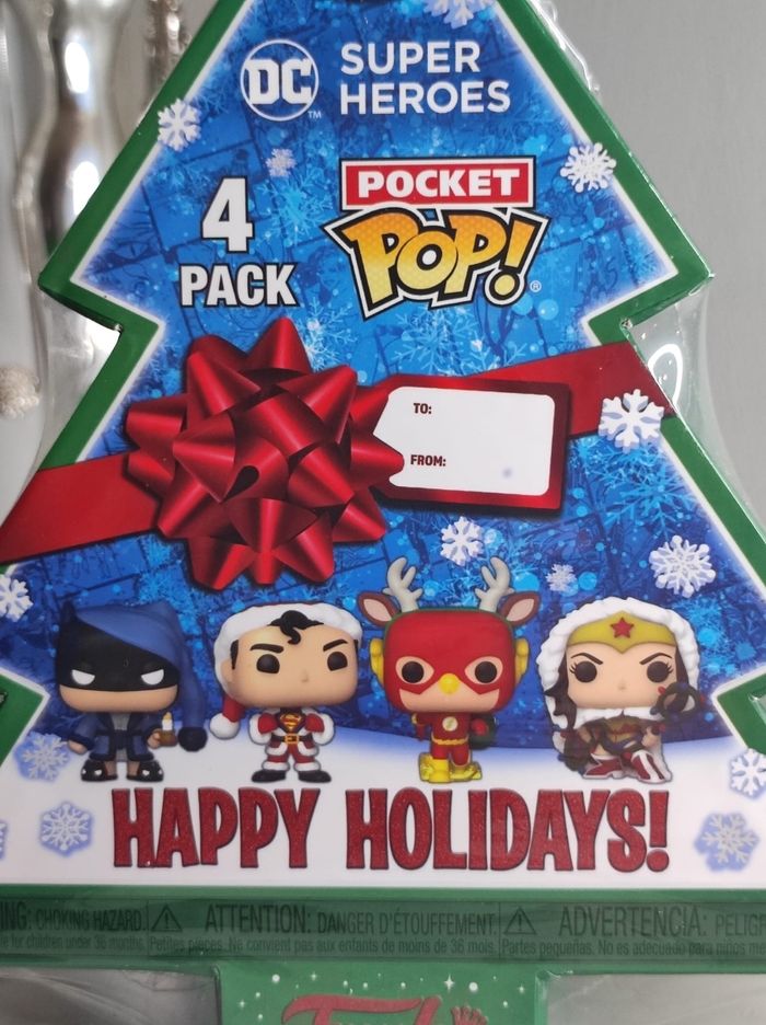 Pack de 4 figurines funko pop en taille pocket (4/5cm) Édition de Noël " happy holidays" Dedans on y retrouve Wonder woman, super man, bat man et flash ( photo de l'intérieur de mon doublon sur demande).