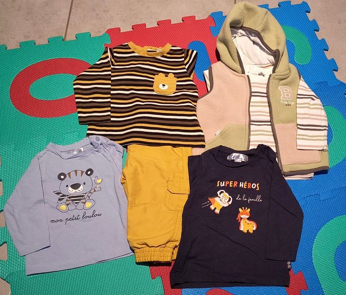 Loit vêtements 12 mois Mes petits cailloux en très bon état 2 tee-shirt manches longues 1 ensemble tee-shirt manche longue+ pantalon 1 ensemble tee-shirt manche longue + veste polaire sans manche