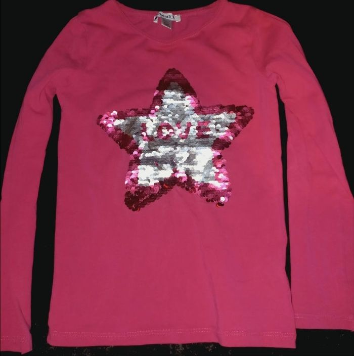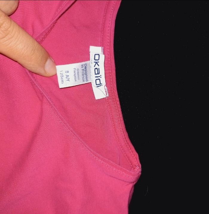 T-shirts pour enfant 8 ans, en très bon état, couleur rose, manches longues, marque : Okaidi,96% coton et 4% elasthanne.