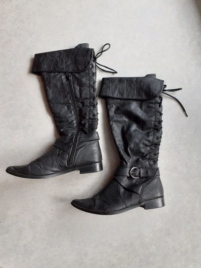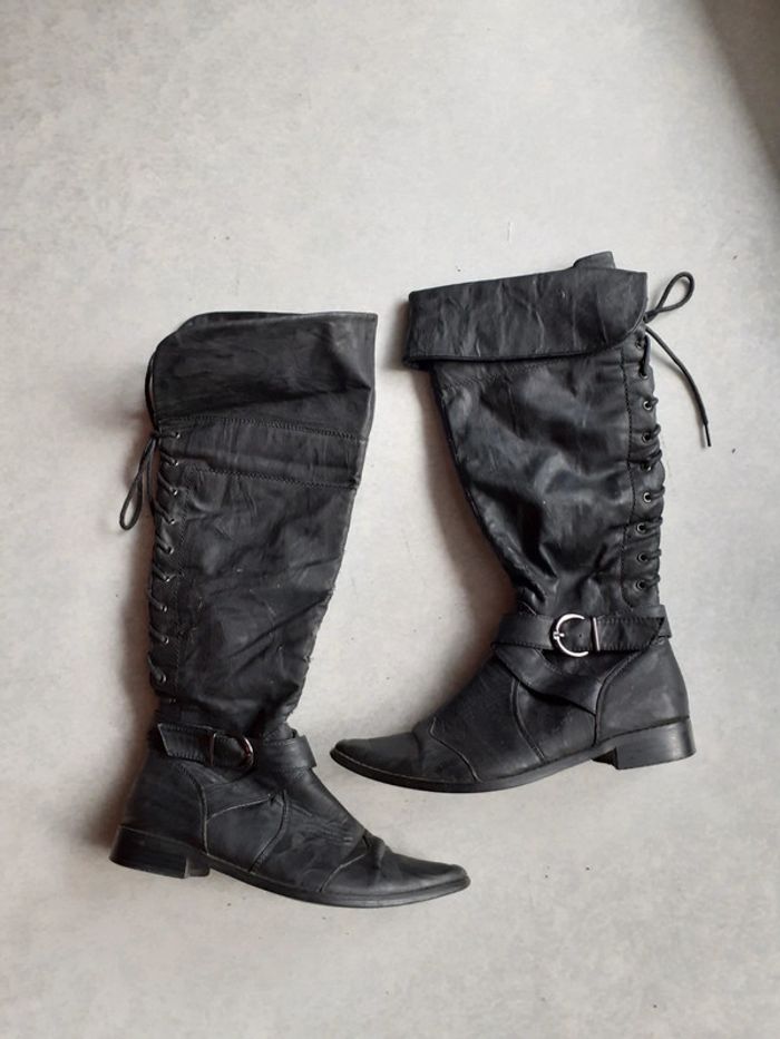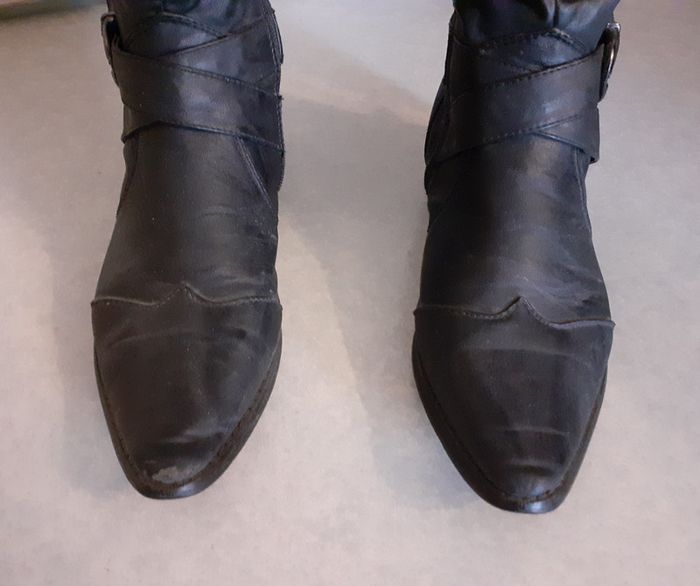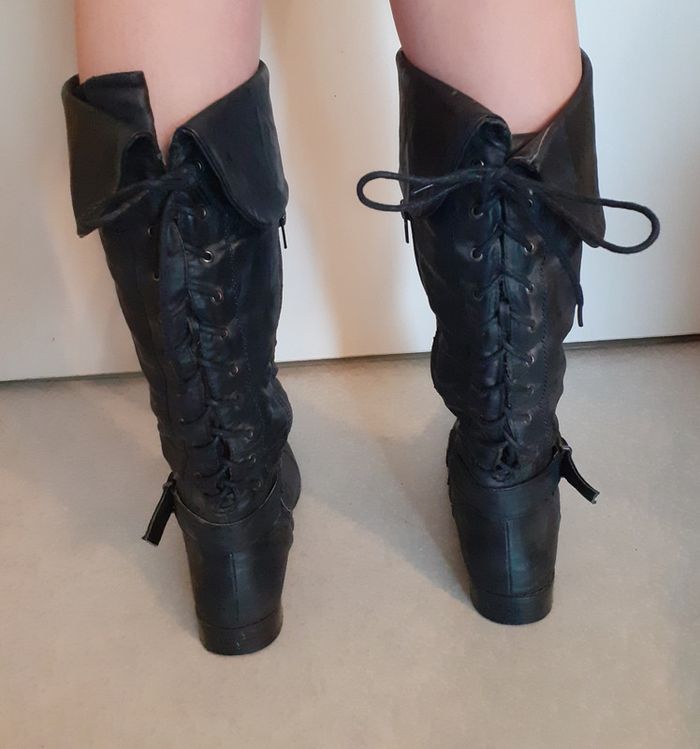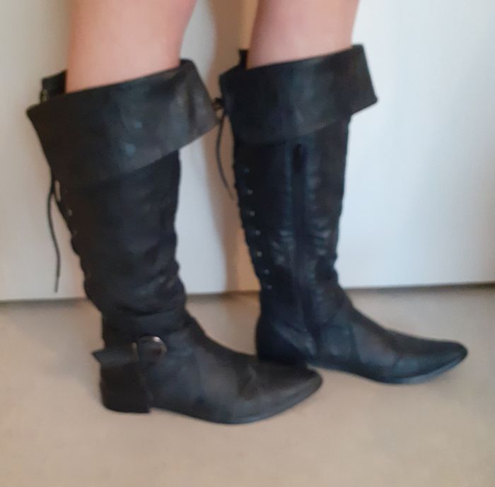 Bottes type cuissardes, fermeture éclair sur le côté, fermeture par lien au dos bande sur la cheville avec crochet noires pointure 38 Un peu usées sur la pliure devant Vente car problème à un pied, je ne peux plus les porter