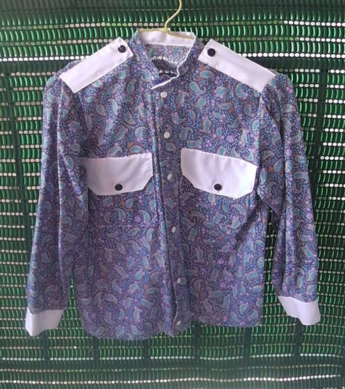 Chemisier manches longues, imprimé, avec poches rabats blancs, épaulettes blanches, poignets blancs.