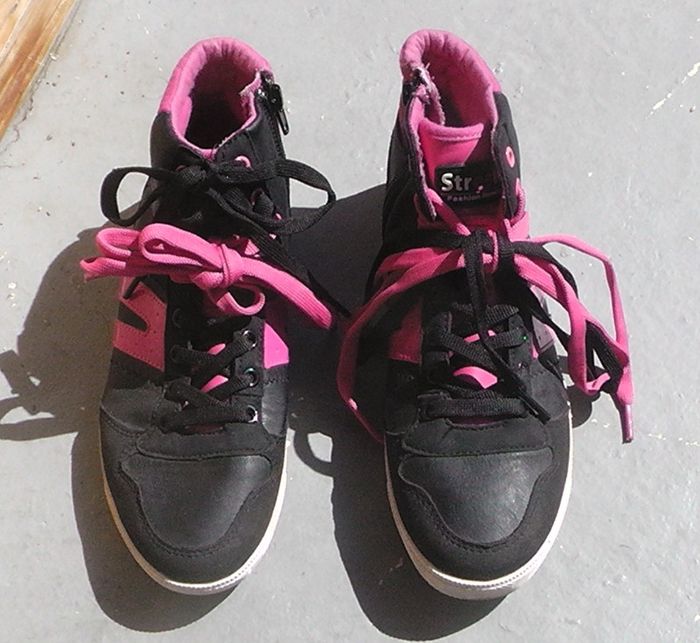 Baskets montantes, noir-rose, avec lacet rose + lacet noir.
