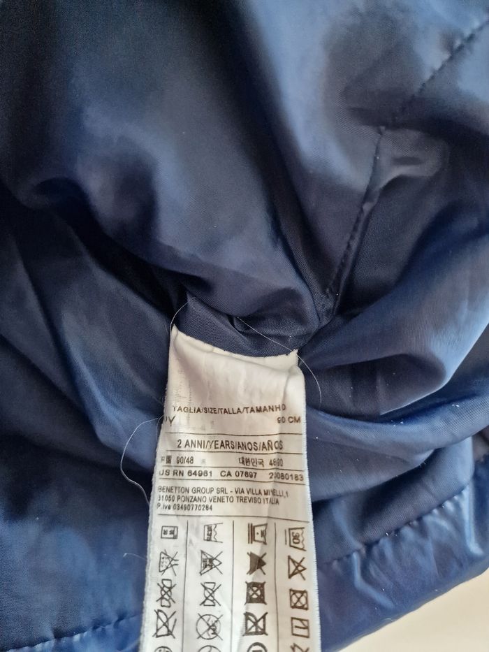 Tous mes articles Benetton : #benettonsev Toutes mes vestes : #vestessev Tous mes habits ♀️ 2 ans : #2anssevfille 🚨 Prix fixe Doudoune / manteau / veste manches longues, avec capuche Marque : UNITED COLORS OF BENETTON Couleur : bleu marine Taille : 2 ans - 90 cm État : très bon état Lichette décousue d'un côté + prénom de ma fille (en dessous du nuage - voir photos) Ma fille a porté la doudoune jusqu'à 3 ans passés. Extérieur : 100% polyester Doublure : 100% polyester Rembourrage : 100% polyester Retrait sur place ou envoi.