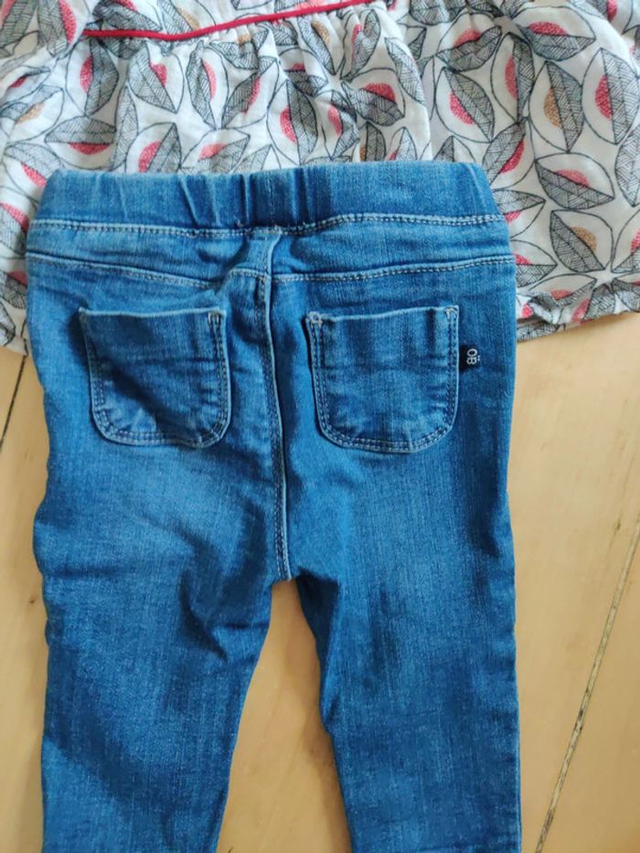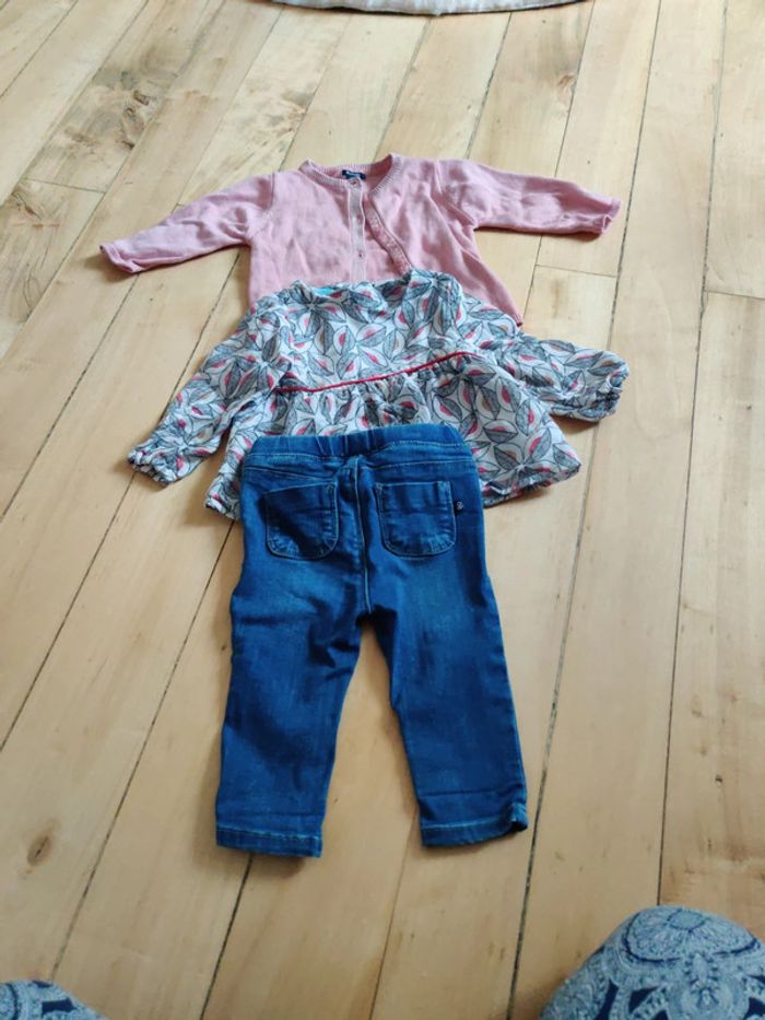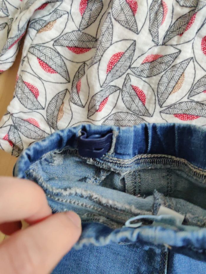 1 jean qui se resserre à la taille okaidi 1 blouse Okaïdi 1 gilet rose et argenté Kiabi