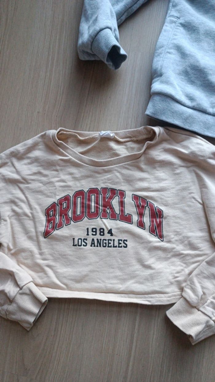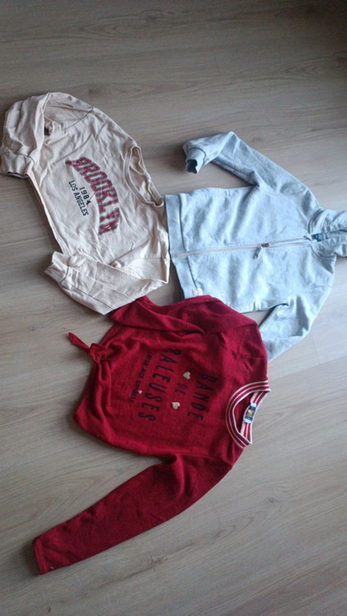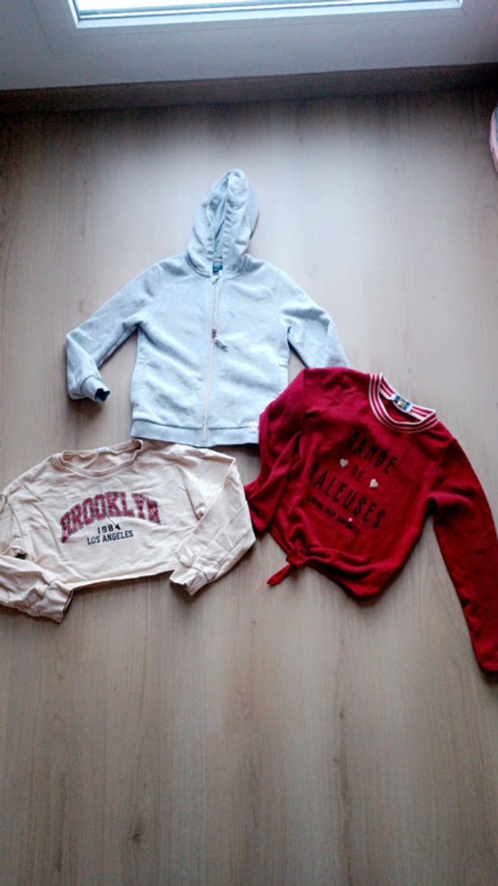 Une veste à capuche grise kiabi en excellent état taille 8 ans Un pull rouge porté quelques fois mais en bon état, quelques bouloches cf photo, inscription "bande de raleuses", étiquette 10 ans mais c'est un 8 ans Crop top sweat SheIn peu porté mais une petite trace à l'avant peu visible, taille 8 ans Prix pour le lot #laura845kids