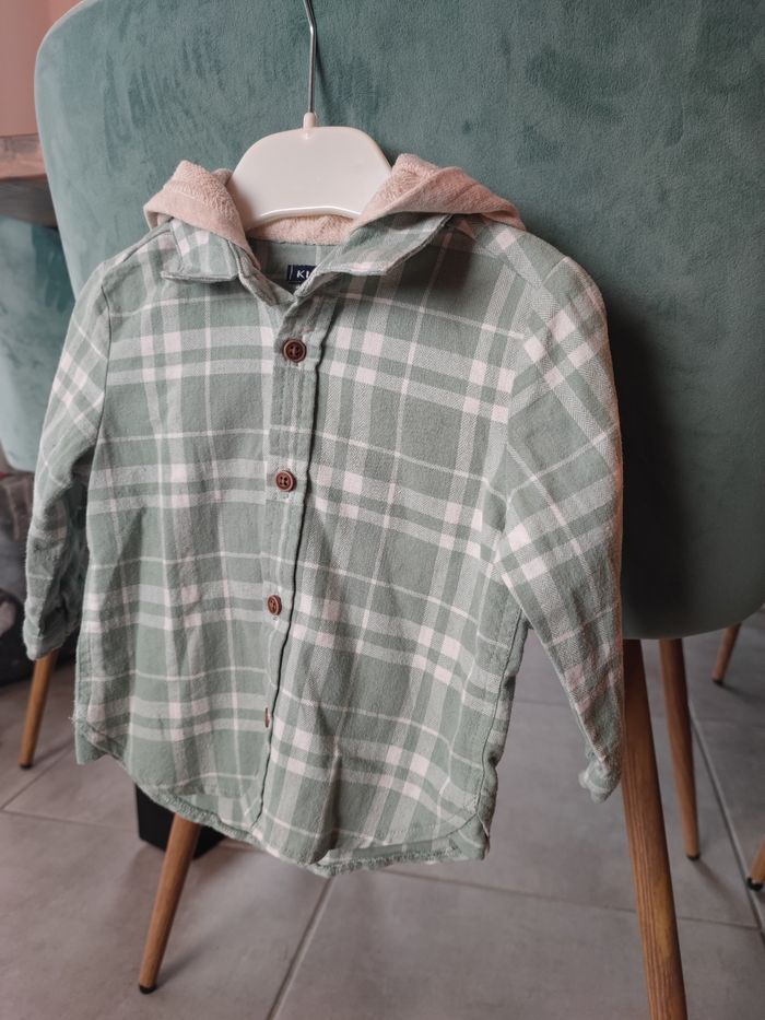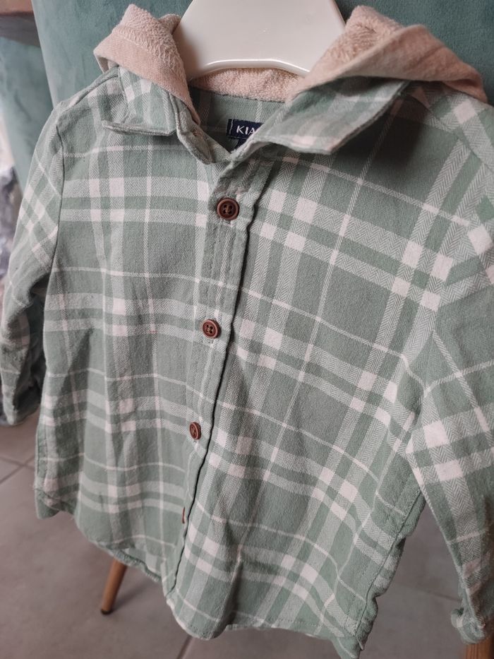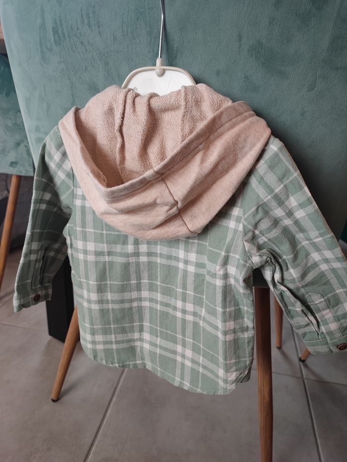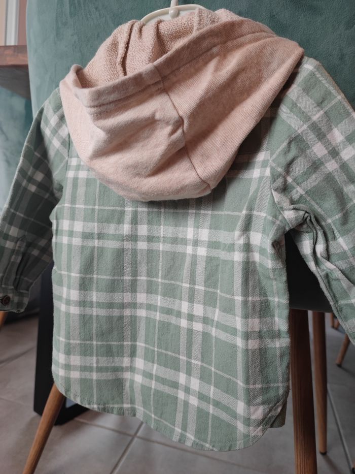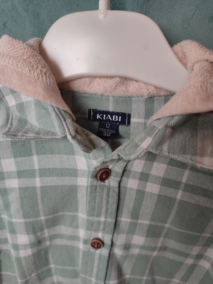 Belle chemise , taille 12 mois Couleur verte claire avec capuche beige Portée que deux fois donc quasi neuve Marque Kiabi chemise