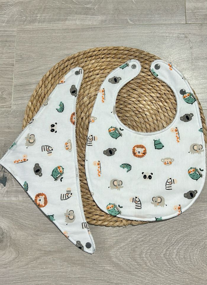 Lot 2 bavoirs ( bandana + simple) Fait entièrement main par mes soins Prix de base 6€ l’unité En coton et éponge Autres tissus et créations disponibles sur demande.
