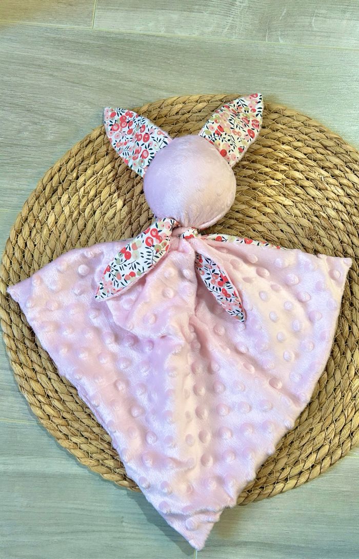 Doudou lapin Fait entièrement main par mes soins En minky et coton Possible de broder le prénom ( +3€) Prix de base 8,50€ Autres tissus et créations disponibles sur demande