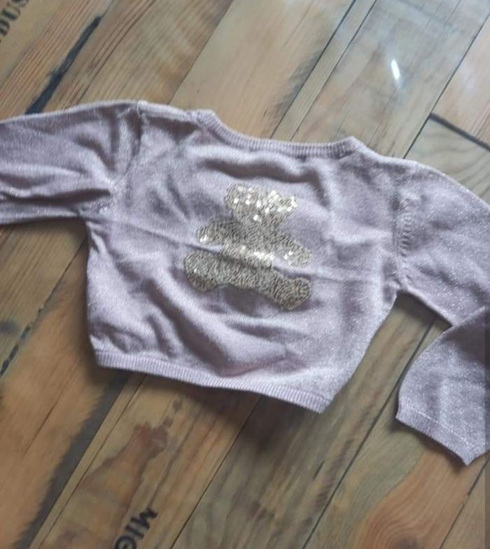FILLE 2 ANS N°360 Cardigan rose poudré Paillette or Un bouton Imprimé ours en sequin ours au dos 71% coton / 17% polyester/ 9% fibre métallique/ 3% polyamide Taille 2 ans / 24 mois Lulu castagnette 5€ #kelly_fille24mois