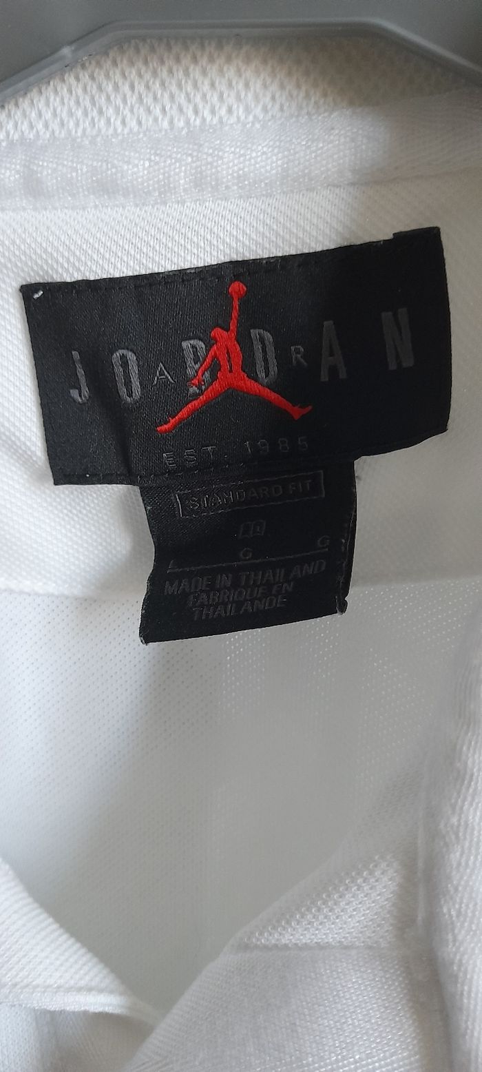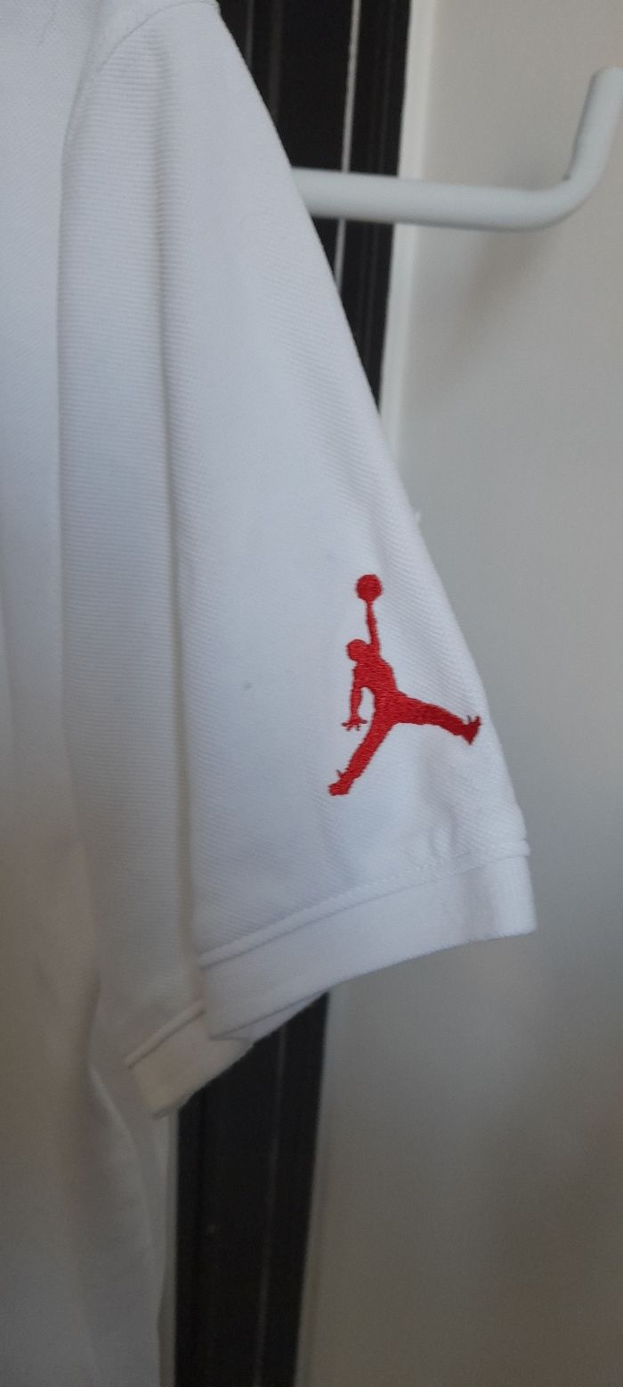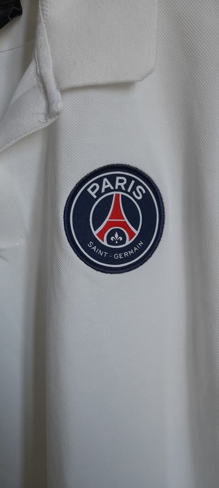 Polo PSG Jordan taille L Couleur blanc Logo Nike sur poitrine gauche Logo JORDAN sur manche gauche Attache boutons 60% coton et 40 % Polyester Très très bon état