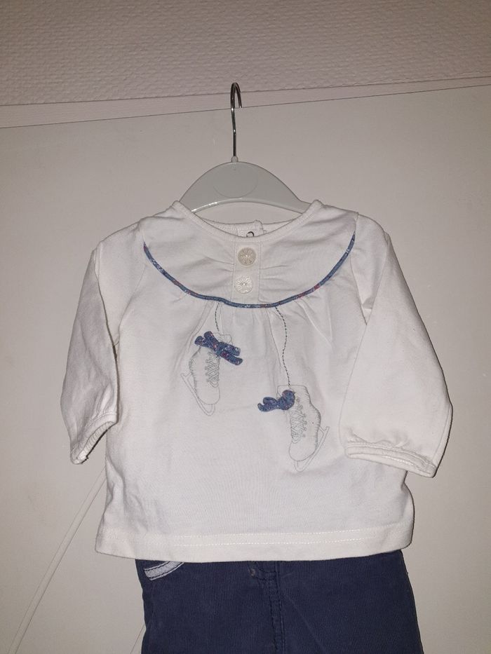 Joli ensemble bébé 6 mois, composé d'un t-shirt manches longue blanc motif patins ⛸ à glace et d'un pantalon en velours côtelé. En TBE, marque Tape à l'oeil 6 mois. #6moissevy57