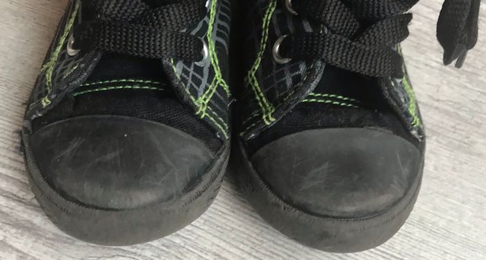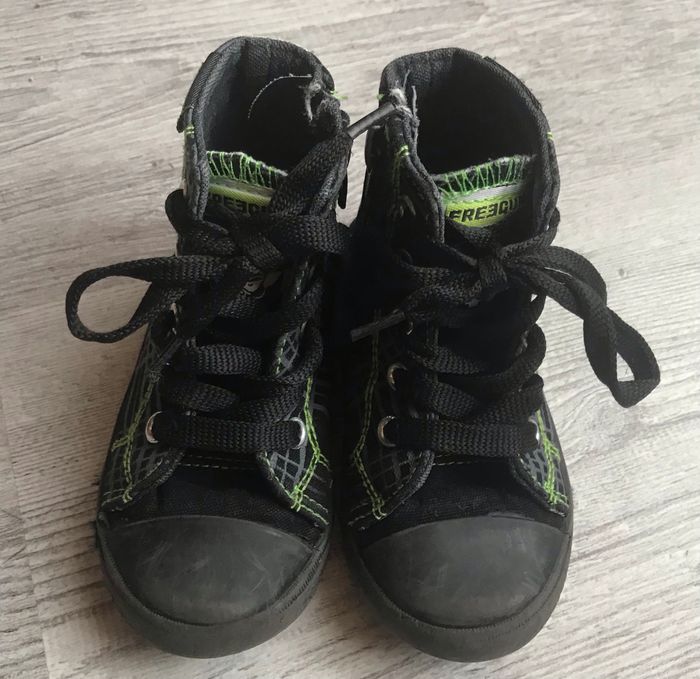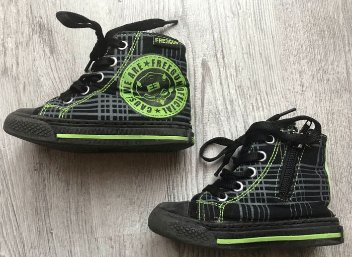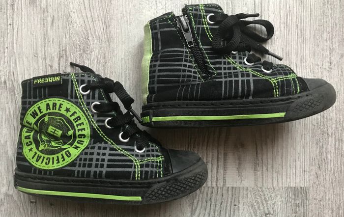 baskets montantes en toile de la marque Freegun taille 23 couleurs noir et vert traces d’usure sur les semelles (voir photos) occasion, état satisfaisant