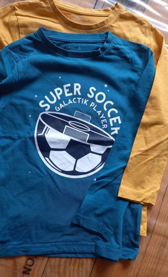 GARÇON 6 ANS N°24 Lot de 2 maillots Longues manches - Vert bleu imprimé ballon - Jaune imprimé chien 100 % coton Taille 6 ans Gémo 3e #kelly_garçon6ans