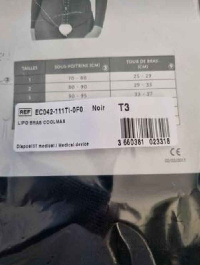 Manchon lipo bras peu servis T3 Mesure sur photo Mis 3 semaines en alternance avec un 2ème Marque medical-Z Valeur neuf 110€