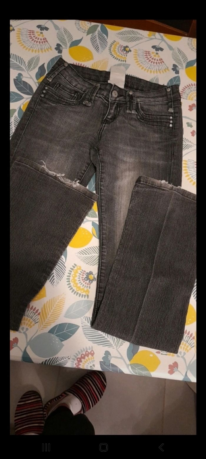 Jean en bon état de couleur gris taille 36. Il est composé de 75% de coton, 23 % polyester et 2% elastane.