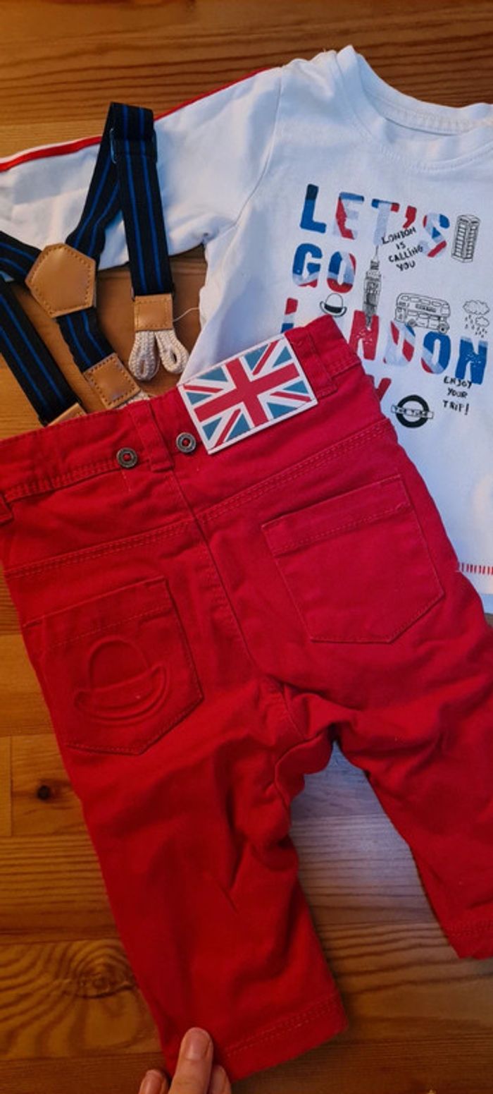 Ensemble garçon 3 mois en très bon état. Un tee-shirt manches longues, pantalon et bretelles. Jolis détails poche arrière.