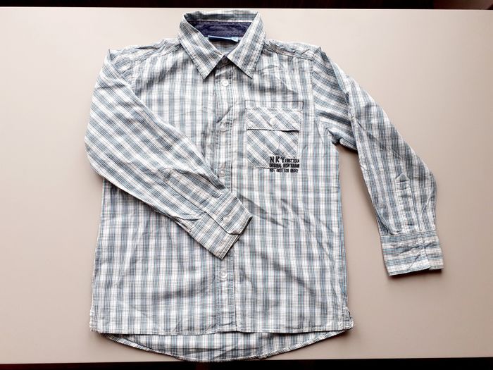 Jolie chemise à carreaux / rayures blanches, bleues et grises. Etat impeccable (portée le jour de la rentrée!) Taille 8 ans