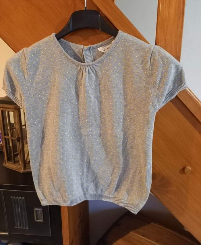 FILLE 5 ANS N°108 Pull manche courte Gris clair pois jaune dos bouton 100% coton Taille 5 ans Kid kanaï 3€ #kelly_fille5ans
