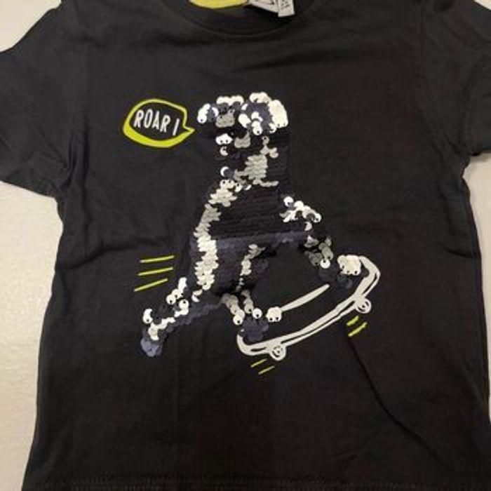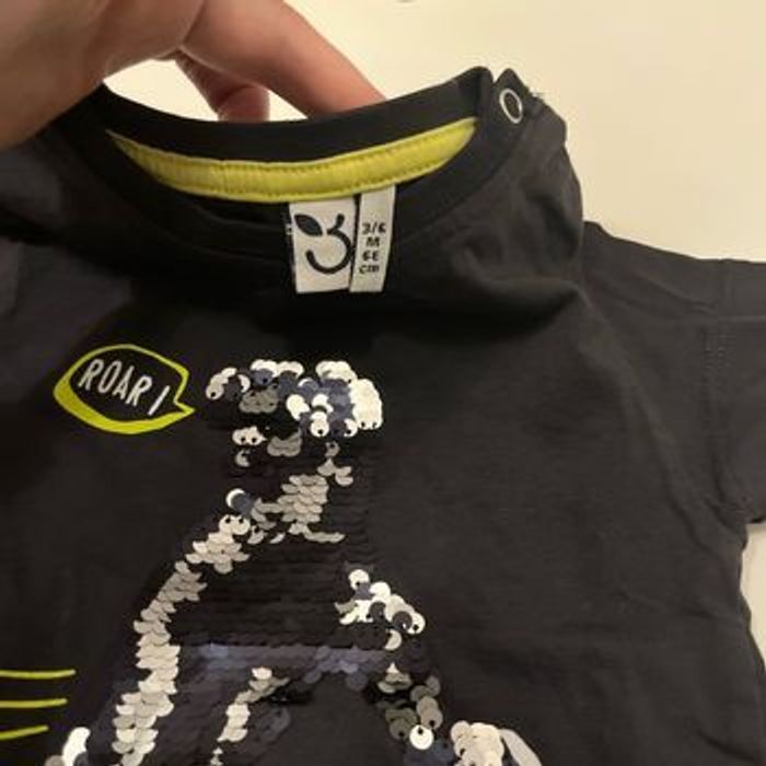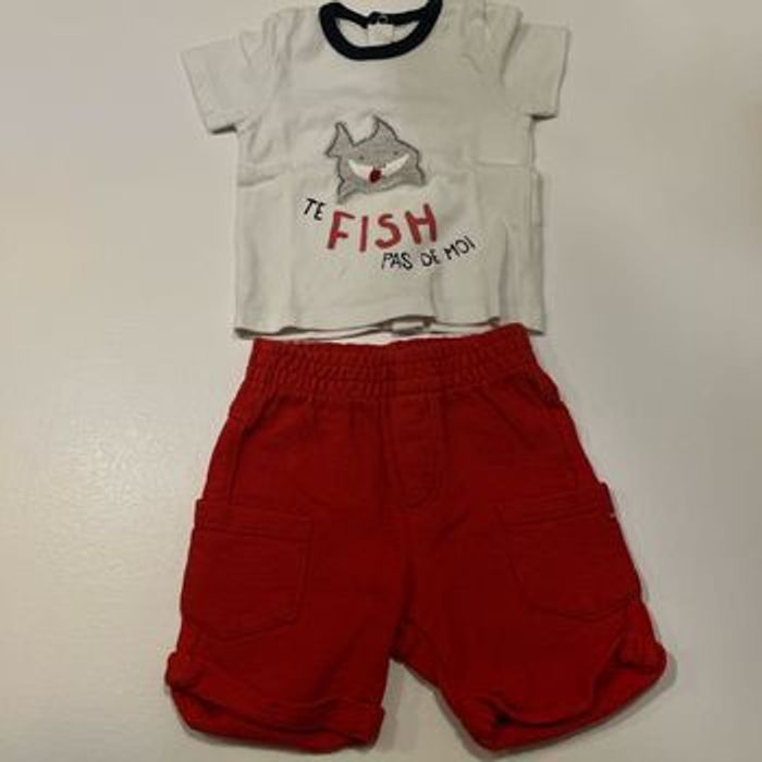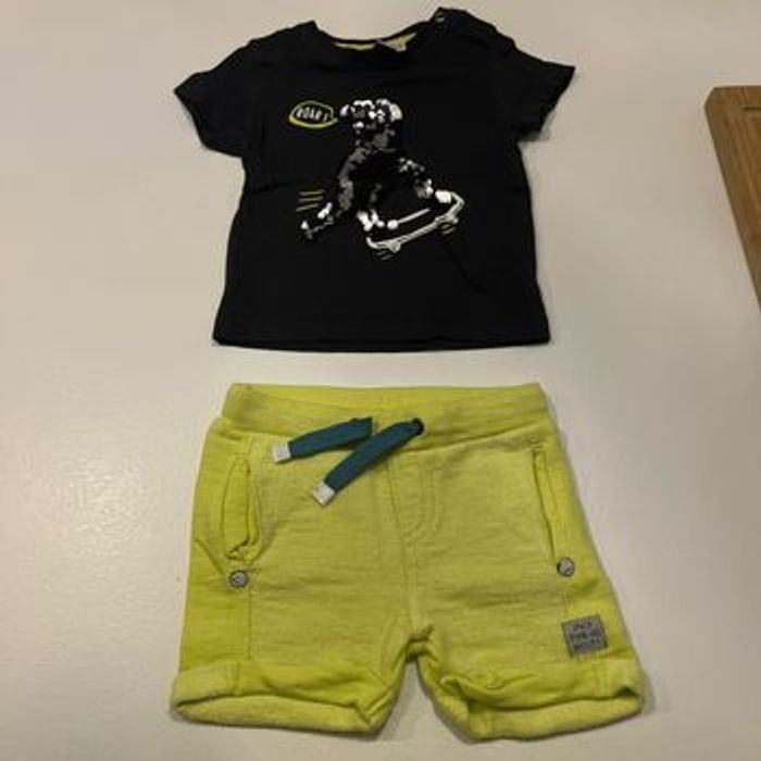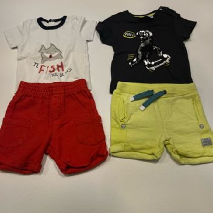 Lot de 2 ensembles été garçon 3 mois Un ensemble avec tee shirt noir à motifs dinosaures à sequins brillants et short jaune marque 3 pommes et l’autre ensemble short rouge et tee shirt blanc marque catimini en très bon état