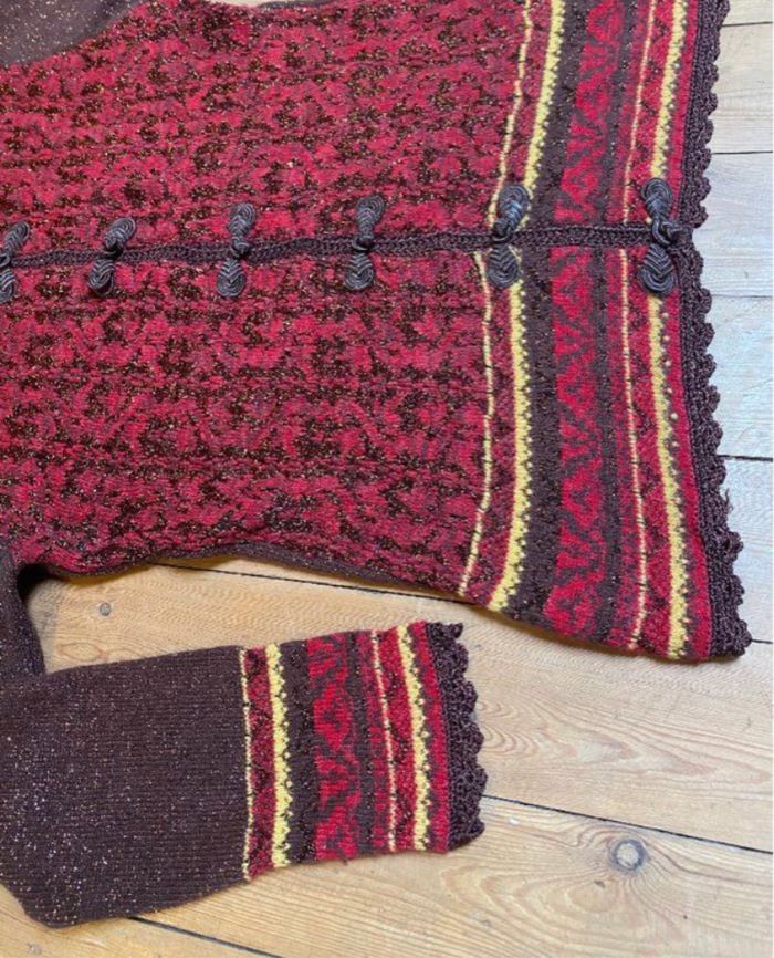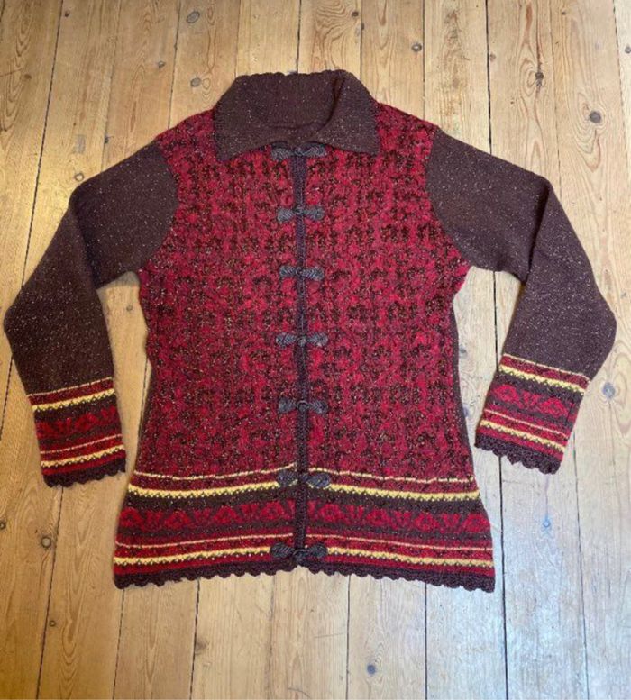 Très joli gilet jacquard dans les tons marron, rouge, jaune moutarde et fil brillant cuivré, double boutonnage, bien chaud et souple, ne pique pas , 77% de laine , 14% viscose, 6% polyester et 3% fil métallisé taille 42 carrure 42 cm longueur des manches 55 cm largeur à plat sous les bras 47,5 cm longueur en partant de l’épaule 64 cm