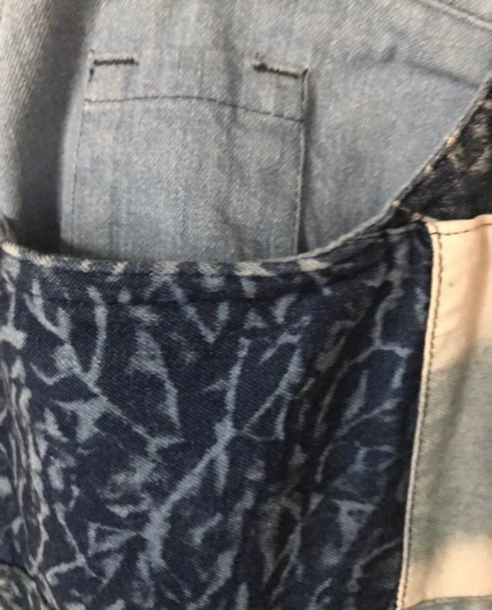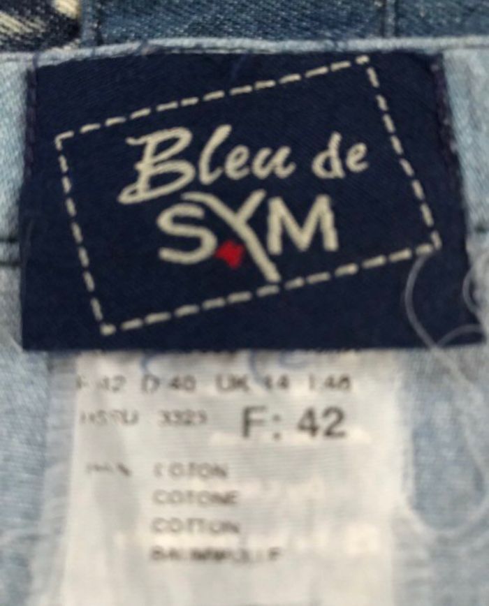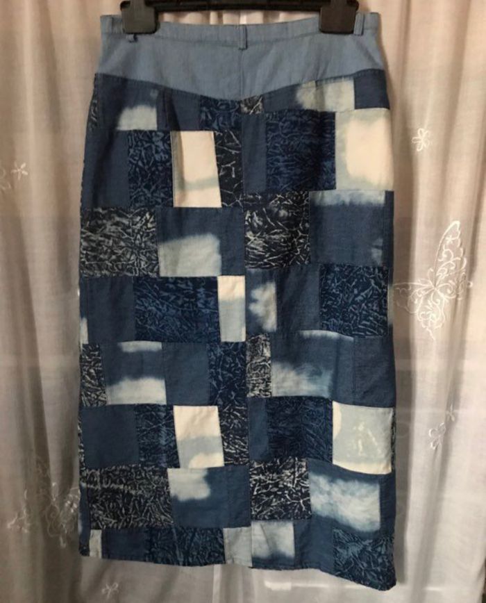 Jupe droite patchwork en jeans assez longue fendue milieu devant 2 poches devant taille 42 vintage donc plutôt 40 aujourd’hui 100% coton Bleu de SYM la ceinture mesure à plat 40 cm à plat niveau hanches 50 cm longueur 86 cm
