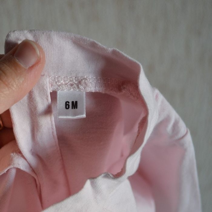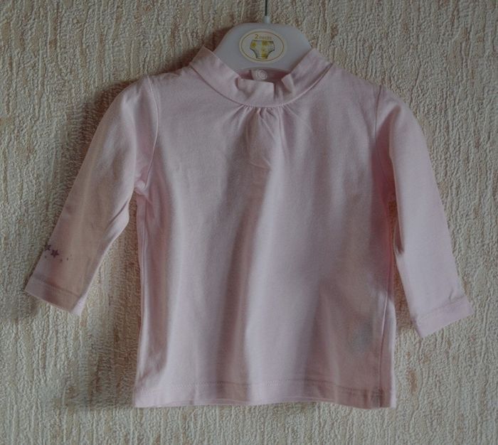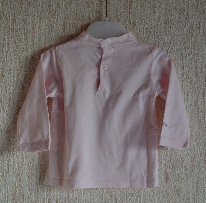 Tee-shirt manches longues de couleur rose pâle. Taille 6 mois. En bon état. Prix : 1€.