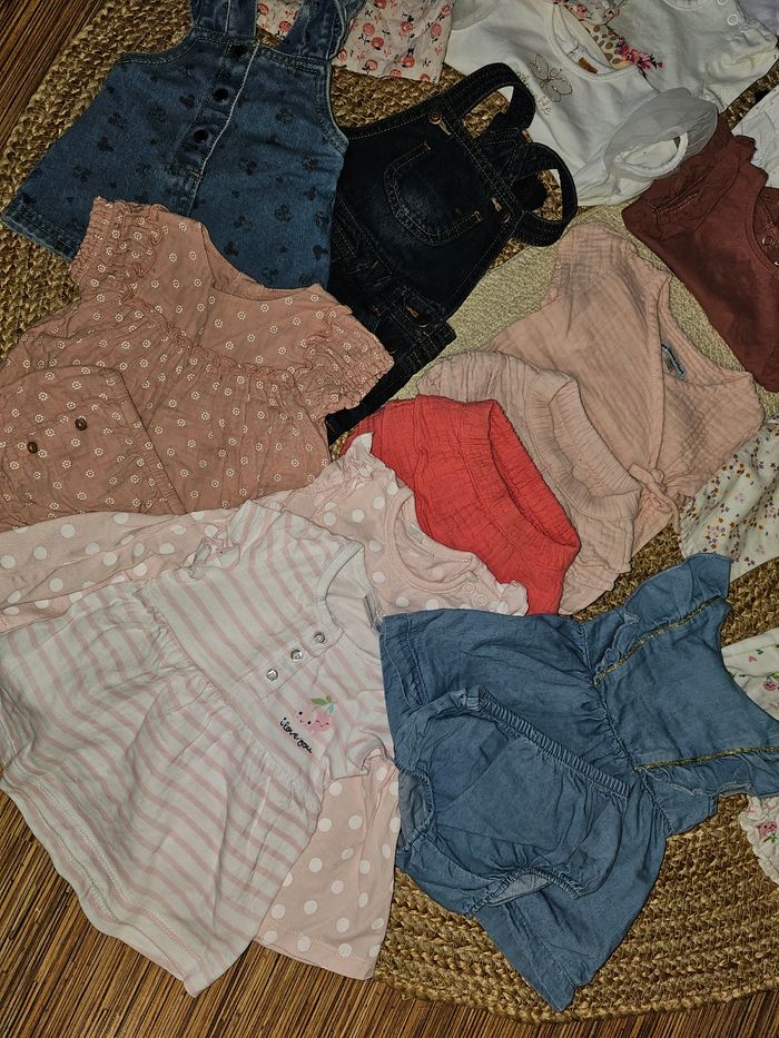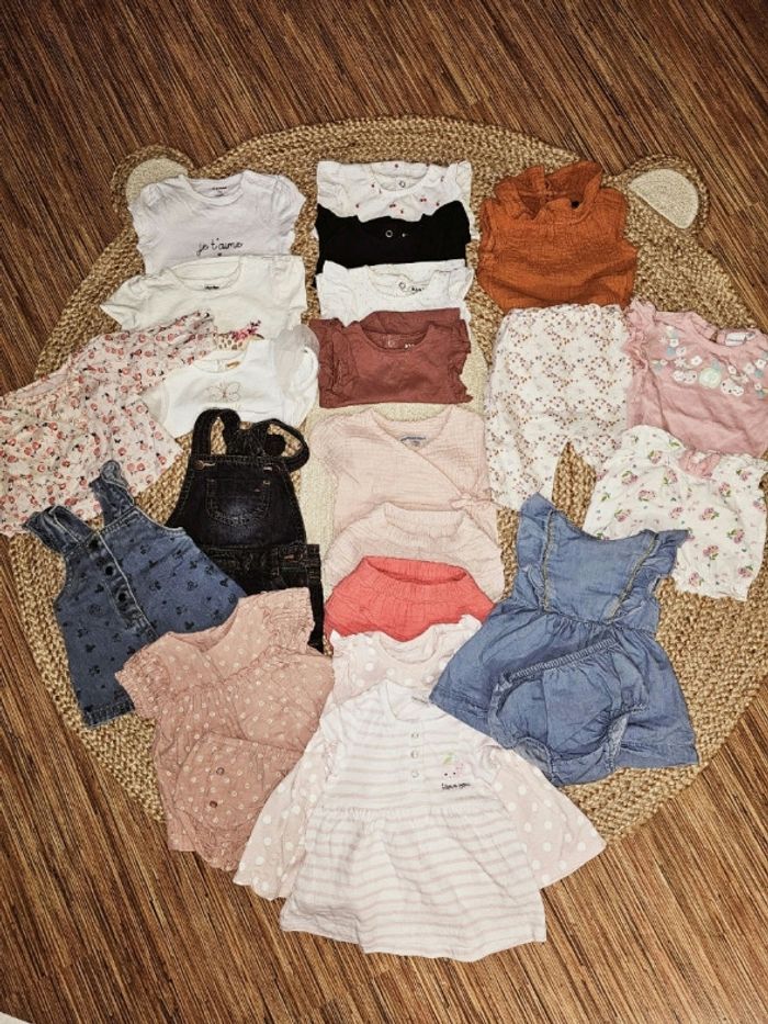 22 pièces en excellents états voir neuves. Taille 1 mois 7 hauts manches courtes 2 robes en jean 1 chemise à manches longues 2 ensembles ( 2 hauts et 2 bas ) 4 bloomers 4 robes 1 body manches courtes Différentes marques