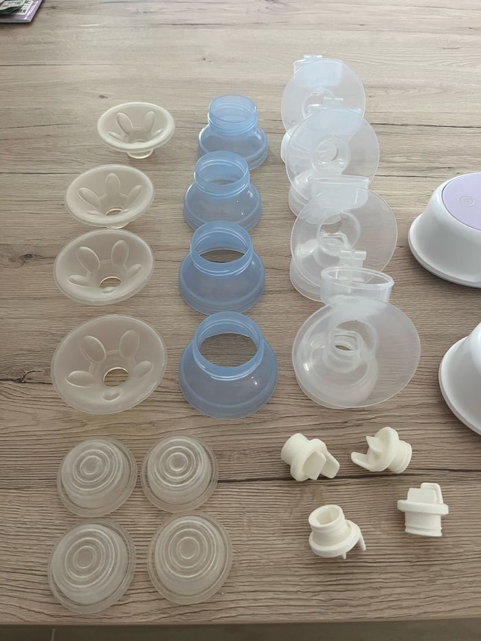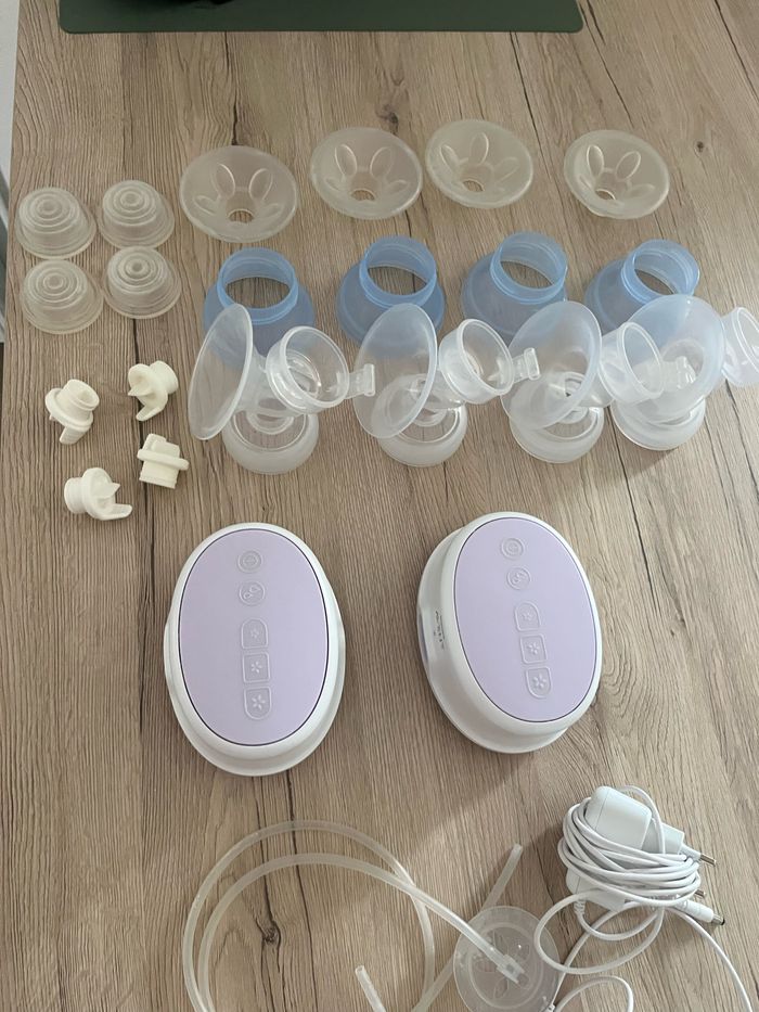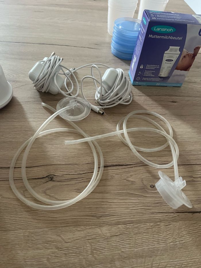 Tire lait électrique deux pompes avec tous les accessoires. Vendu avec des pochettes de congélation et 10 pots de conservation en plastique. Acheté en 2019