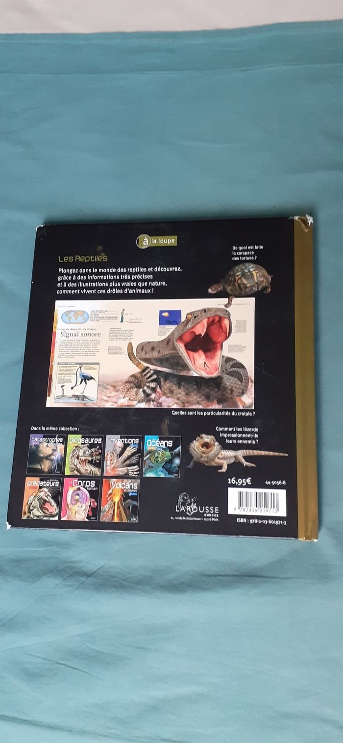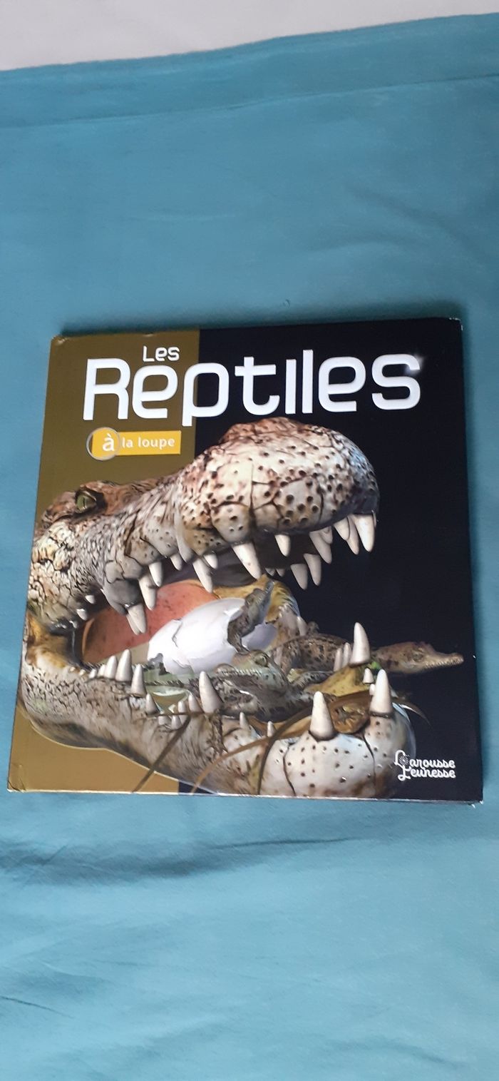 Vends un grand livre sur les reptiles de 64 pages illustrées avec un glossaire à la fin. Couverture en surimpression éditions Larousse Jeunesse 2022. Fait partie d une collection sur la découverte de la nature. Coins légèrement abîmés.