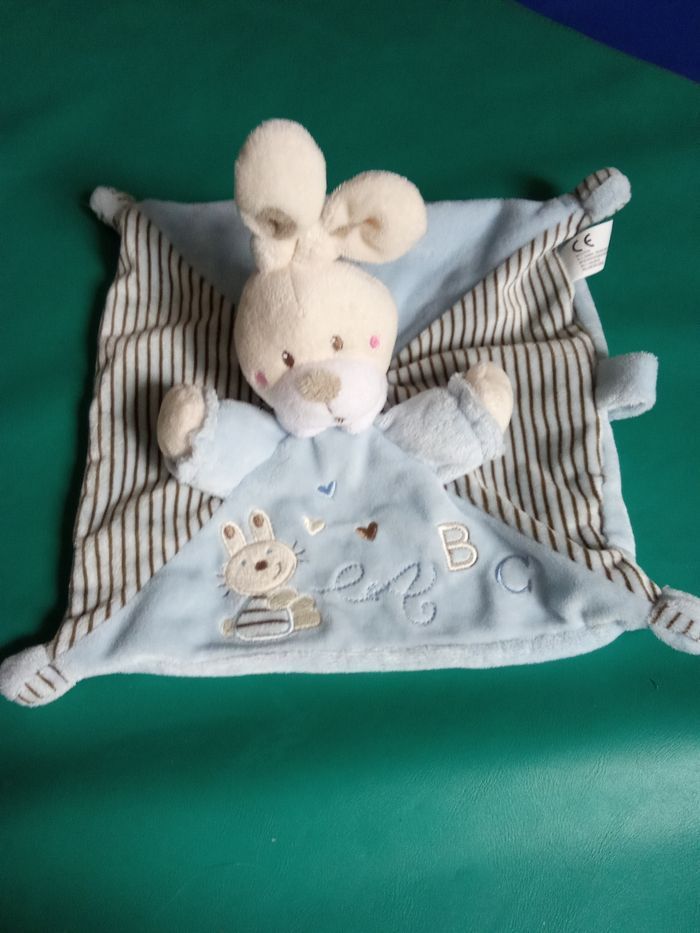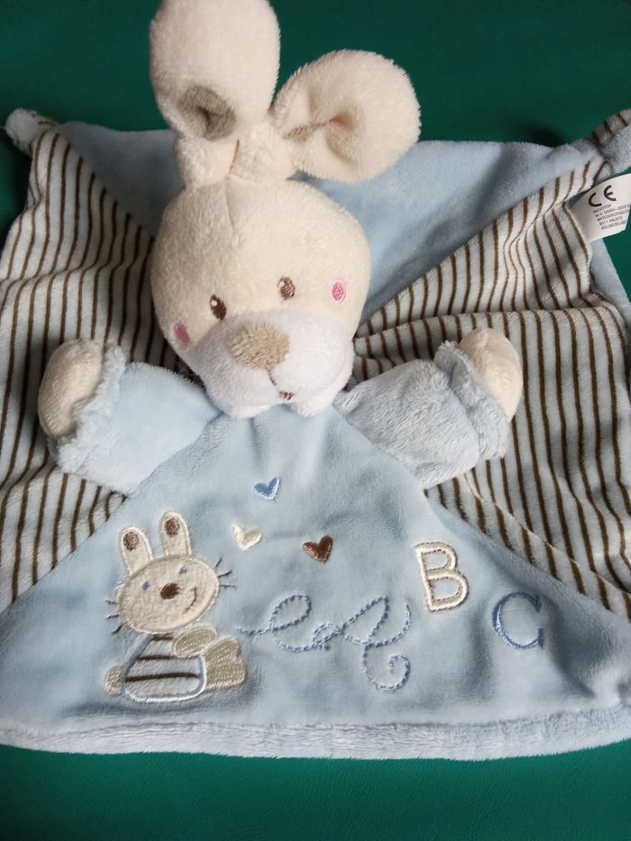 Très beau doudou pour bébé garçon, idéal doublon, 2 étiquettes présentes, 1 attache tétine, broderie abc sur le devant. 🎈pas d'étiquette de marque mais de la marque nicotoy. 📌 J'en propose un autre mm collection mais autre coloris. Bon état général. Beaucoup d'autres doudous enfant mm collection également à vendre ds mon dressing et réduction activée