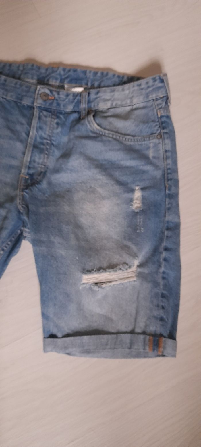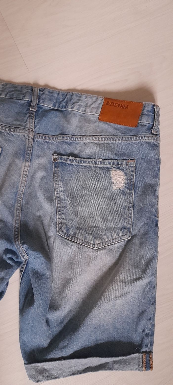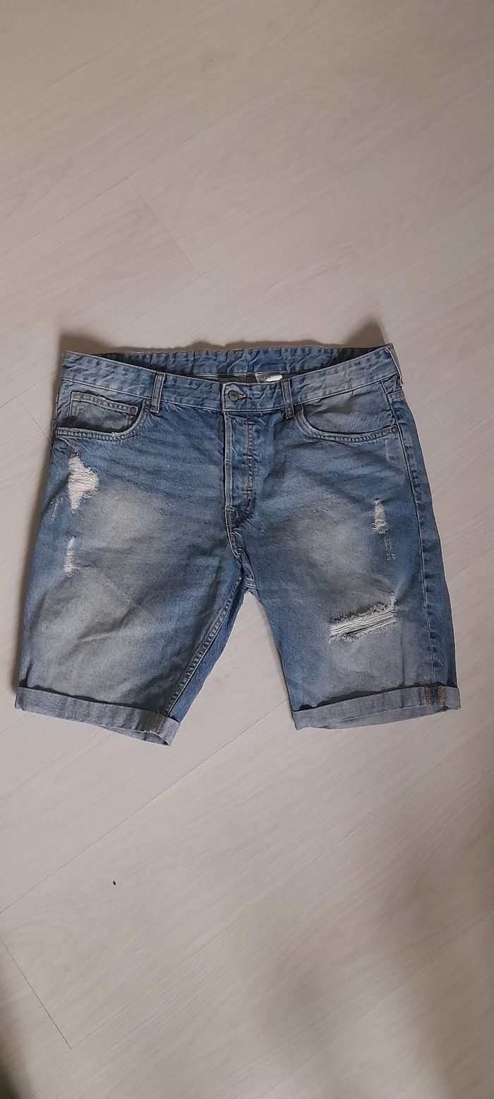 Short jeans T 38 Marque H&M Couleur bleu 3 poches devant 2 poches arrière Passants pour ceinture 100 % coton Attache boutons Très très bon état