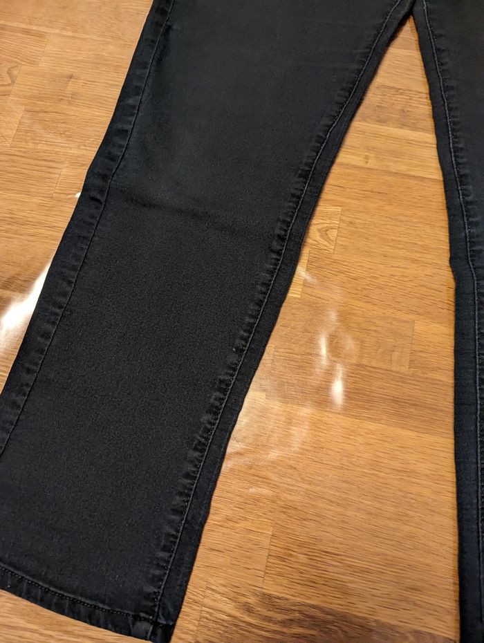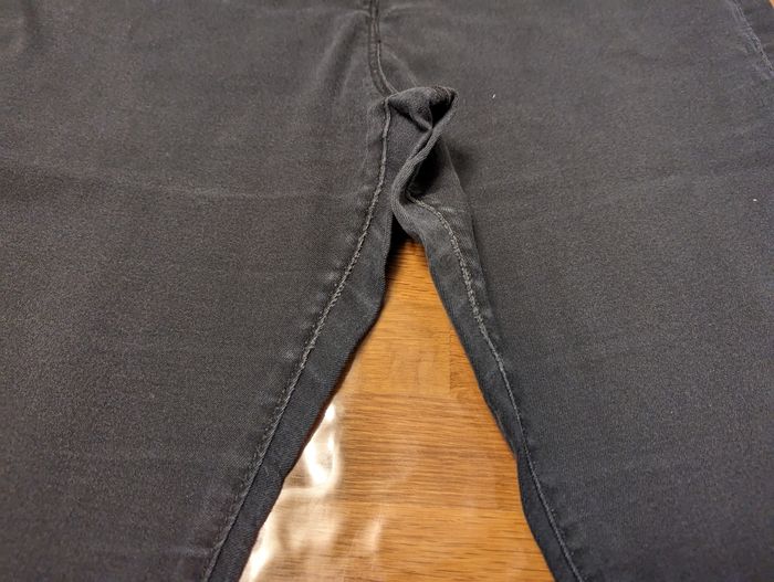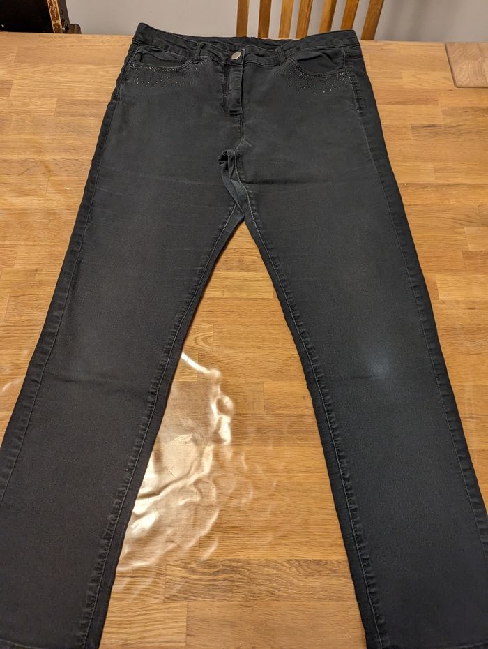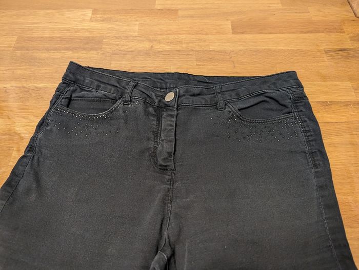 Pantalon femme taille 44 Bon état général, il manque des strass, la fermeture a été changée, la couleur est passée et il y a un petit défaut vers la couture intérieure en bas du pantalon, un peu plus usé aux genoux. L'étiquette est effacée. Longueur entrejambe 73 cm Tour de taille environ 93 cm