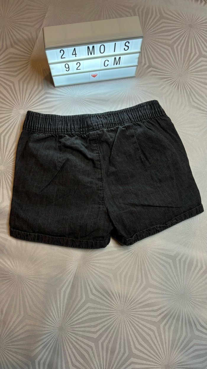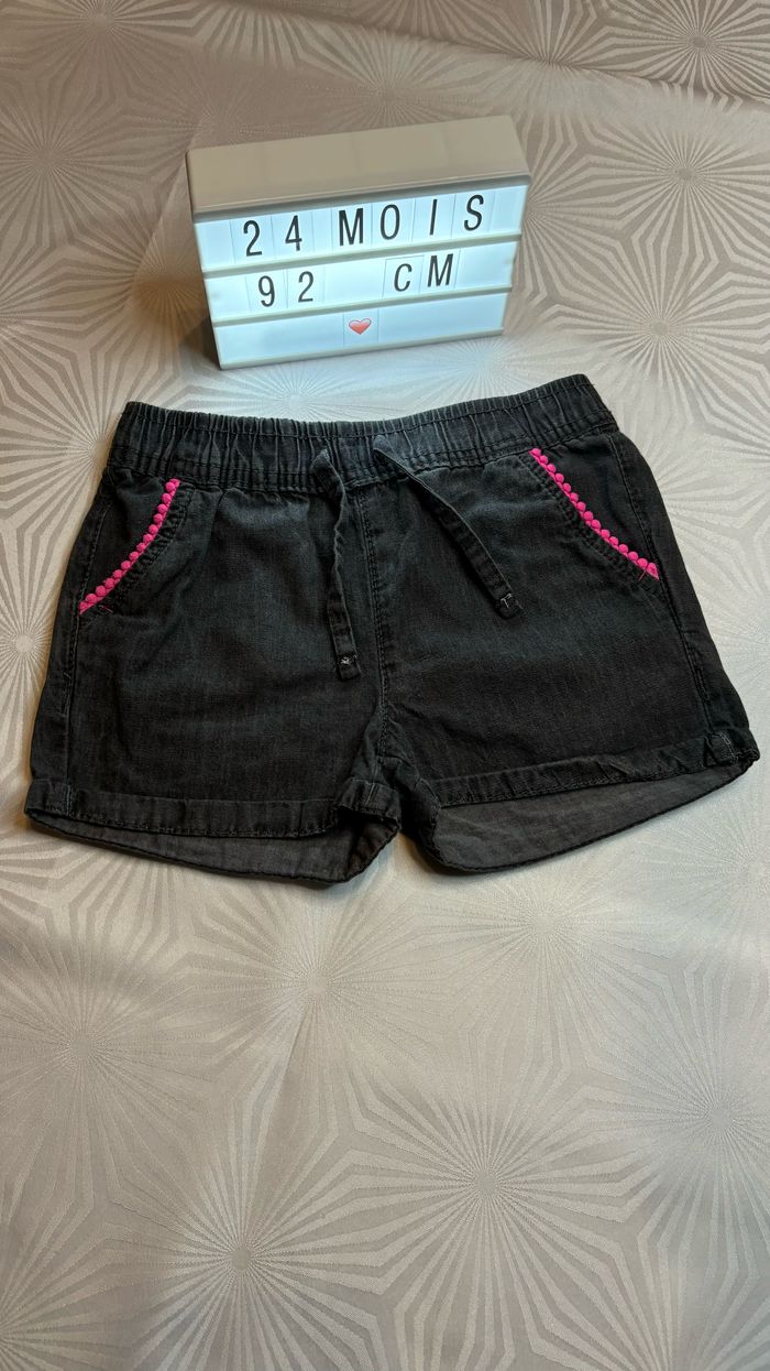 ☀️ Short léger effet jean☀️ 🩷 Taille: 24 mois - 92 cm 🩷 Marque: Kiki & koko 🩷 Couleurs: Noir, gris effet jean et rose fluo aux poches 🩷 Taille élastique