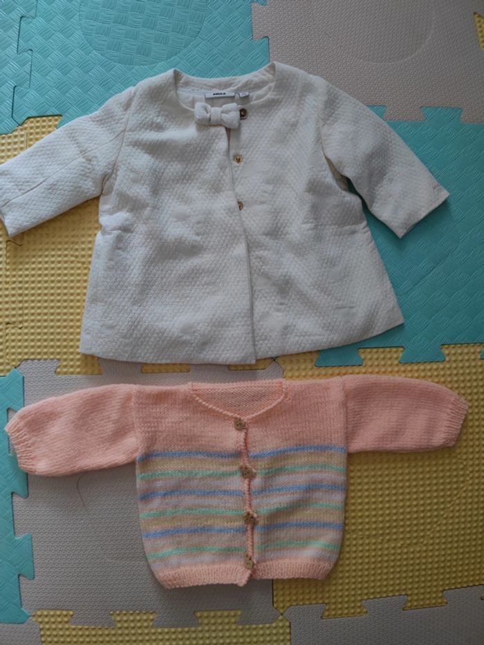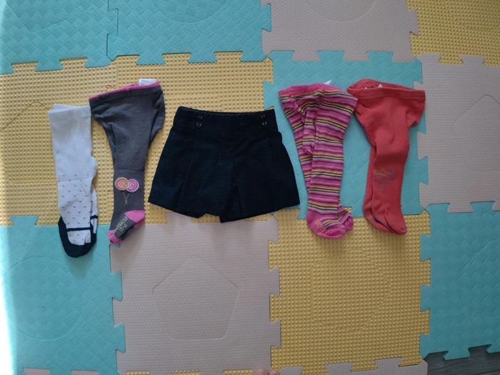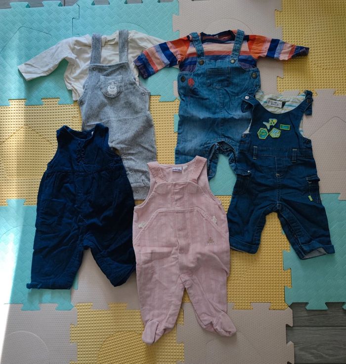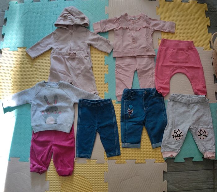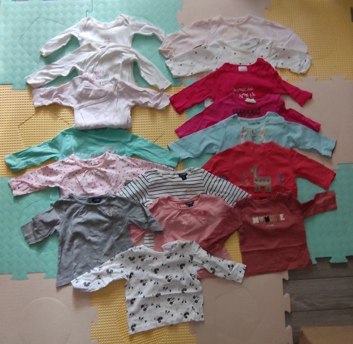 43 vêtements ; - 7 pyjamas velours - 3 body manches longues - 13 t-shirt manches longues (2 t-shirt taché) - 2 vestes -1 short + 4 collants - 5 pantalons - 1 pull - 2 ensembles - 5 salopettes Le tout 20€