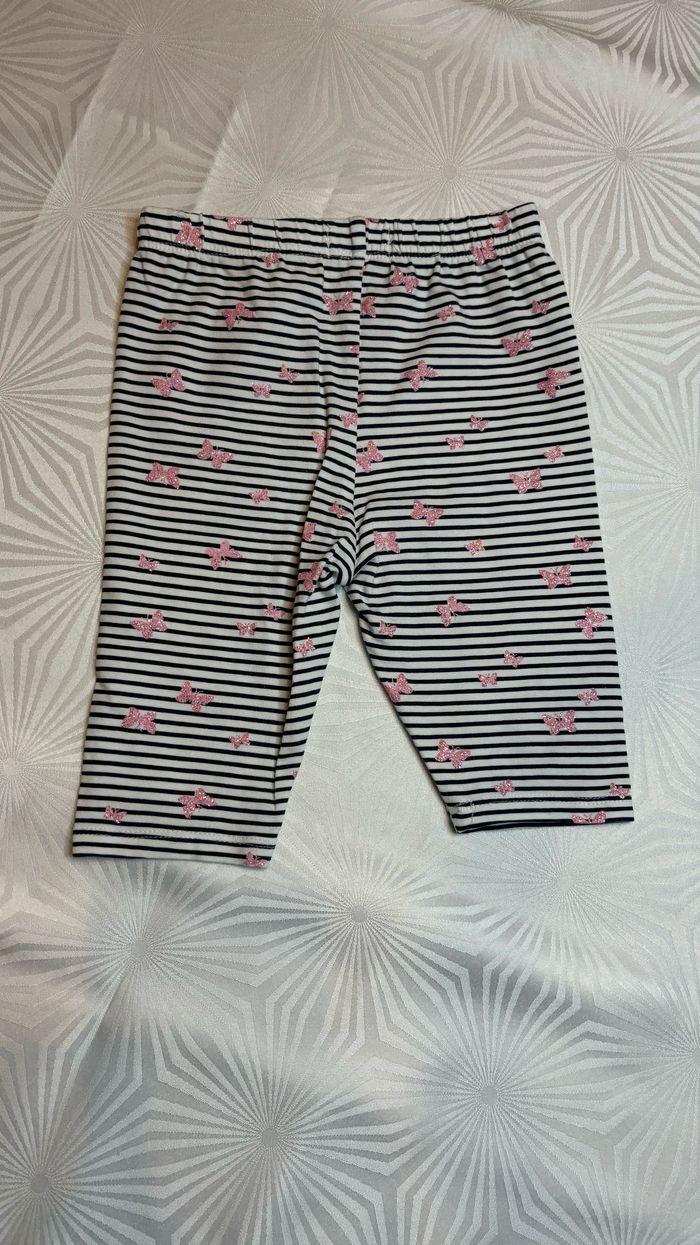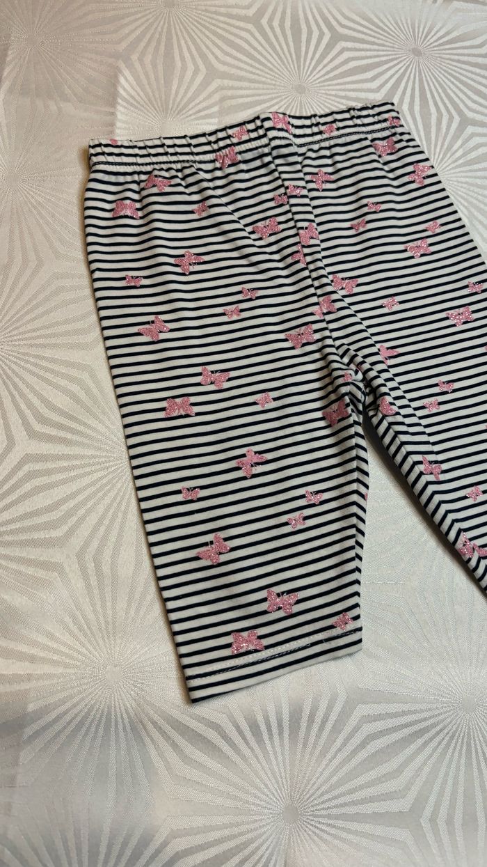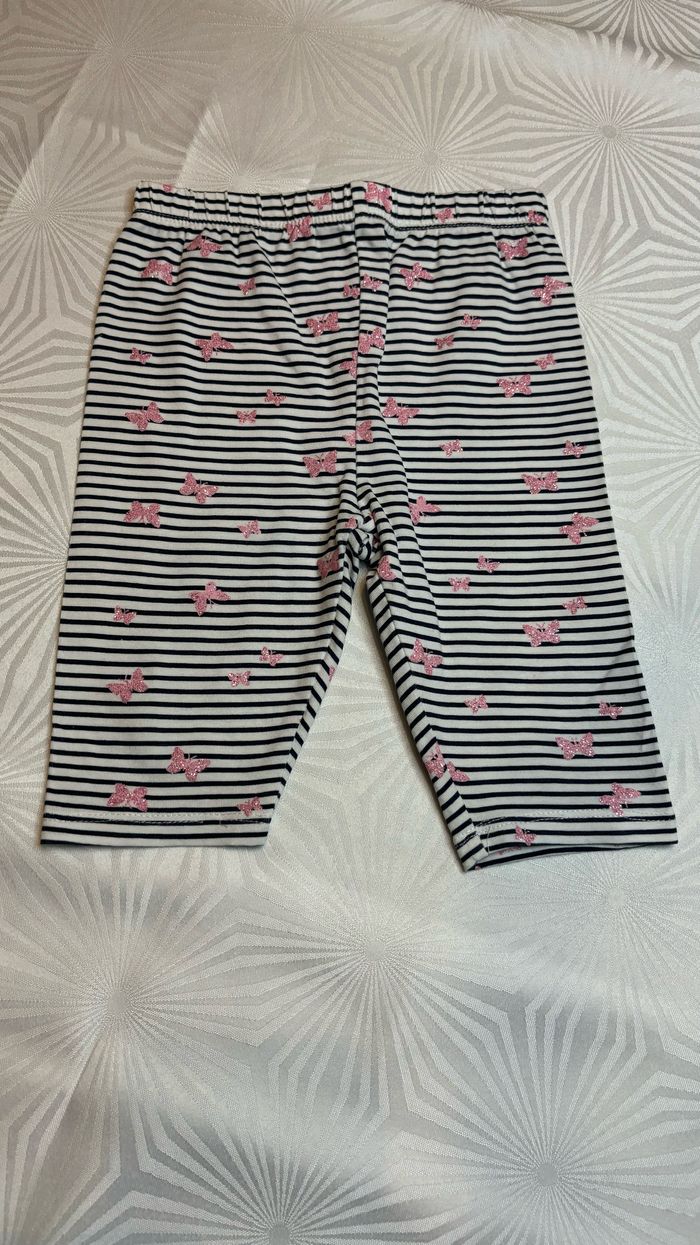 🦋 Pantacourt legging 🦋 🩷 Taille: 24 mois - 92 cm 💕 Marque: In extenso 🩷 Couleurs: Blanc et bleu marine rayé avec des motifs papillons roses paillettés 💕 Taille élastique