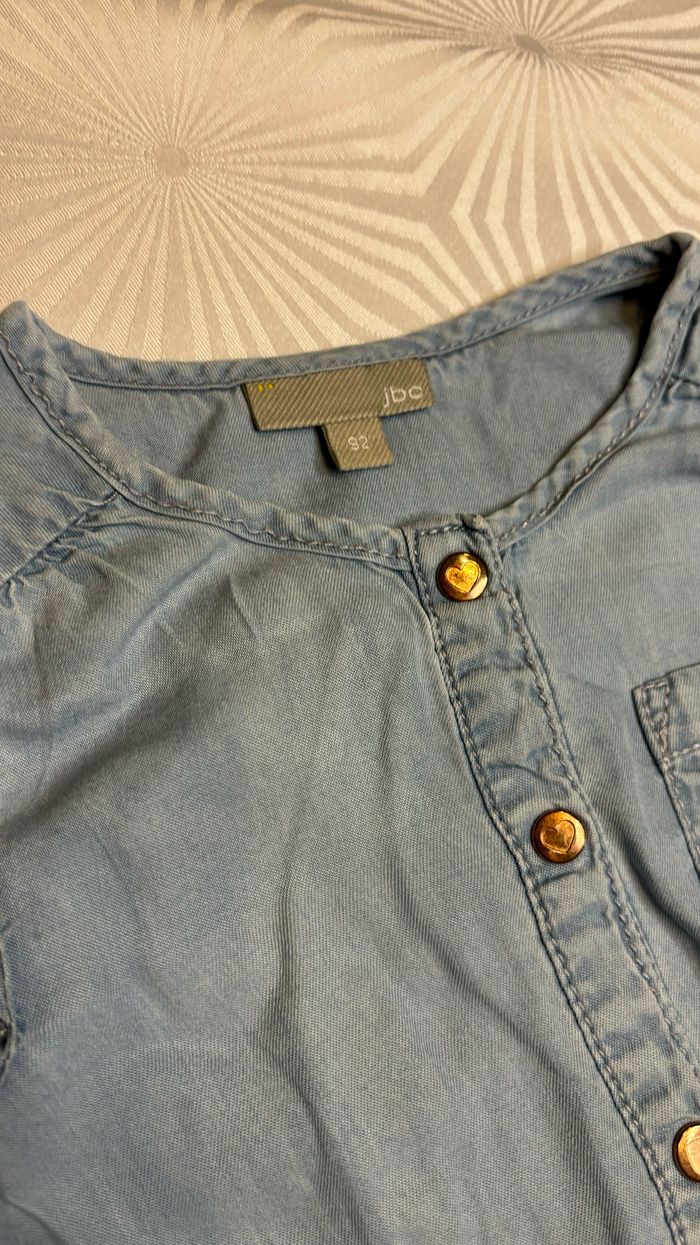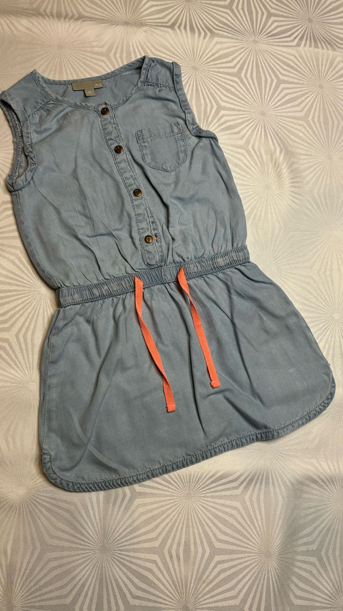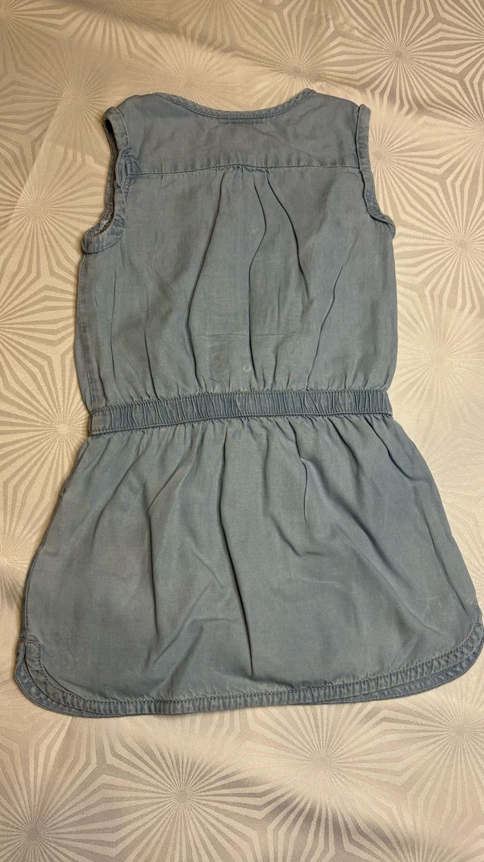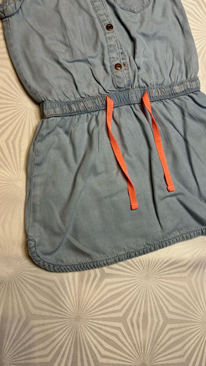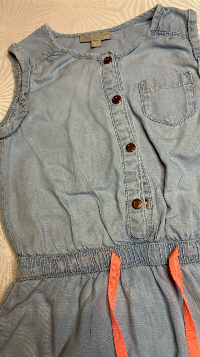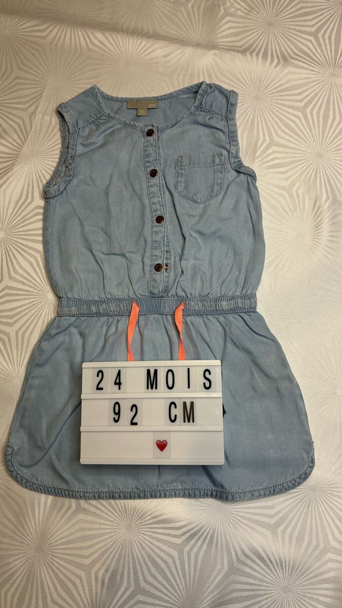 👗 Robe légère débardeur effet jean 👗 🎀 Taille: 24 mois - 92 cm 🎀 Marque: JBC 🎀 Couleurs: Bleu clair effet jean et lien orange fluo ‼️ Des petites taches sur l’avant sont visibles sur les photos