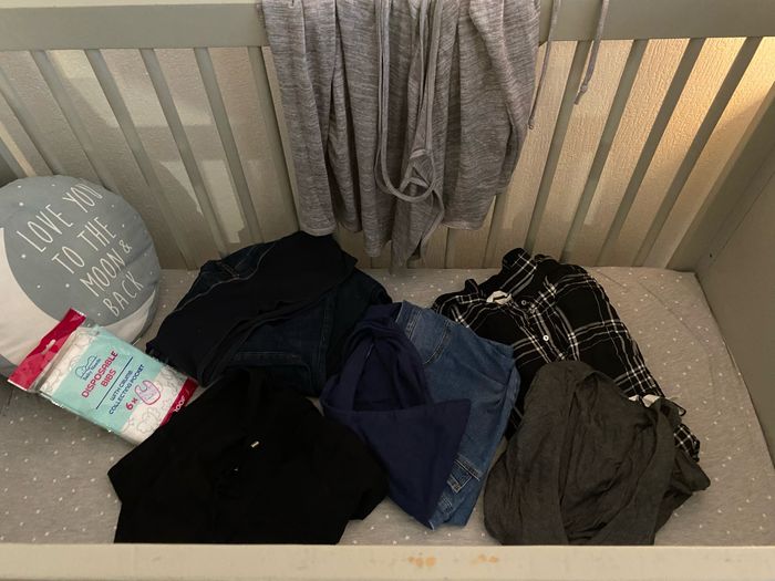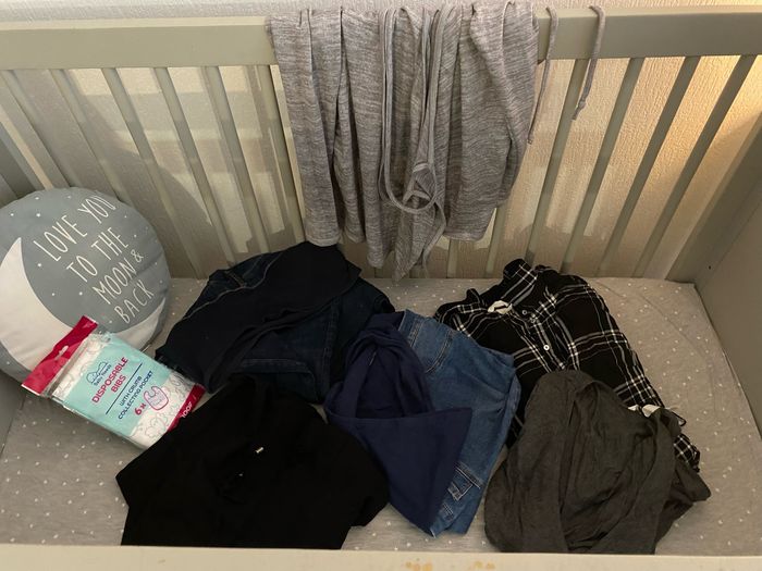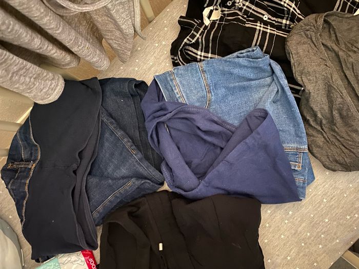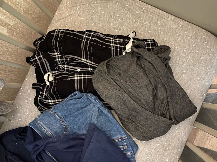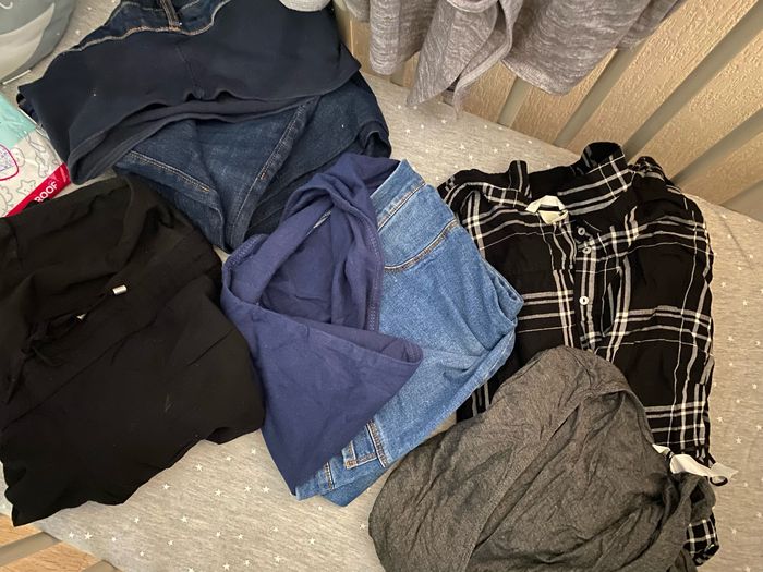 Lot de vêtements de grossesse composé de 2 jeans et 1 pantalon noir + une tunique noir à carreau avec boutons ainsi qu’un top d’allaitement gris et un cardigan d’allaitement En très bon état / marque H&M