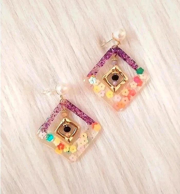 Boucles d'oreilles losange en résine avec paillettes et petites fleurs - photo numéro 1