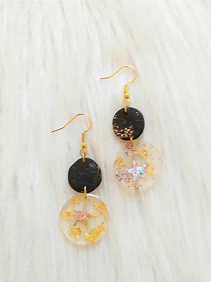 #cencovbijoux Boucles d'oreilles pendantes chics pendants ronds avec feuille d'or En argile polymère et résine époxy. Longueur totale 5,5 cm. Diamètre du plus gros cercle 2,2 cm. Neuves