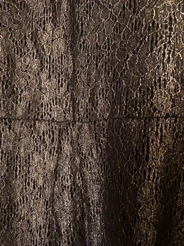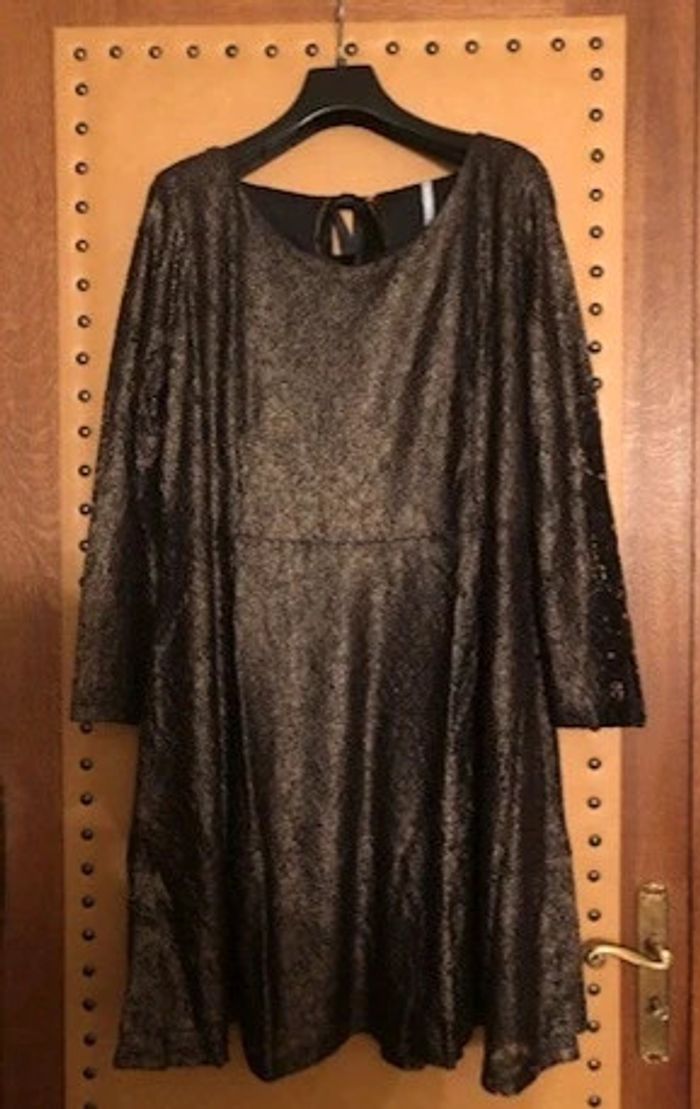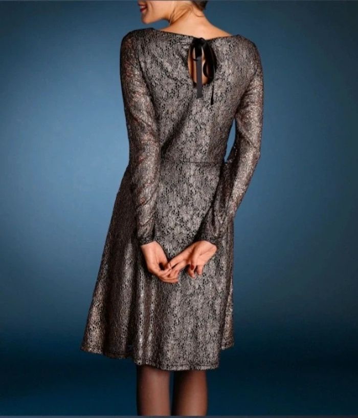 Robe dentelle doublée en maille. Jolie coupe évasée. Col rond dégagé Découpe goutte d'eau au dos avec joli nœud à nouer. Manches longues en dentelle non doublée. Long. 96 cm env. Dentelle 92% polyamide 8% élasthanne.  Doublure maille 100% polyester. Neuve jamais portée #sisterkayafemmeT52 Taille : 52 Coloris : noir/doré Prix : 35€ Ref : BP628557 - BL- e.hg +1