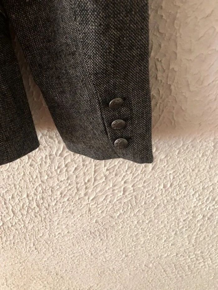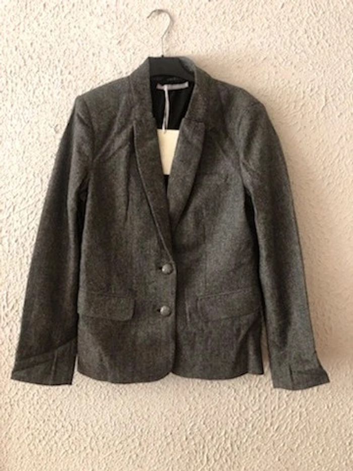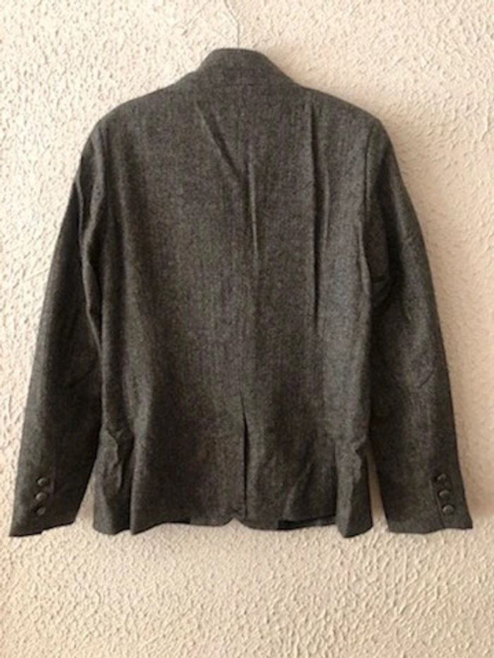 Veste col fantaisie style tailleur. - Poches passepoilées avec rabat légèrement en biais. - Poche poitrine. - Fines épaulettes. - Manches longues avec fente et 3 boutons. - Fente milieu dos. - Longueur milieu dos 65 cm environ. COMPOSITION - Lainage : 80% polyester, 20% laine. - Doublure 100% polyester. Taille : 42 Coloris : gris anthracite Prix : 25€ #sisterkayafemmeT42 Neuve jamais portée Réf : c.ea